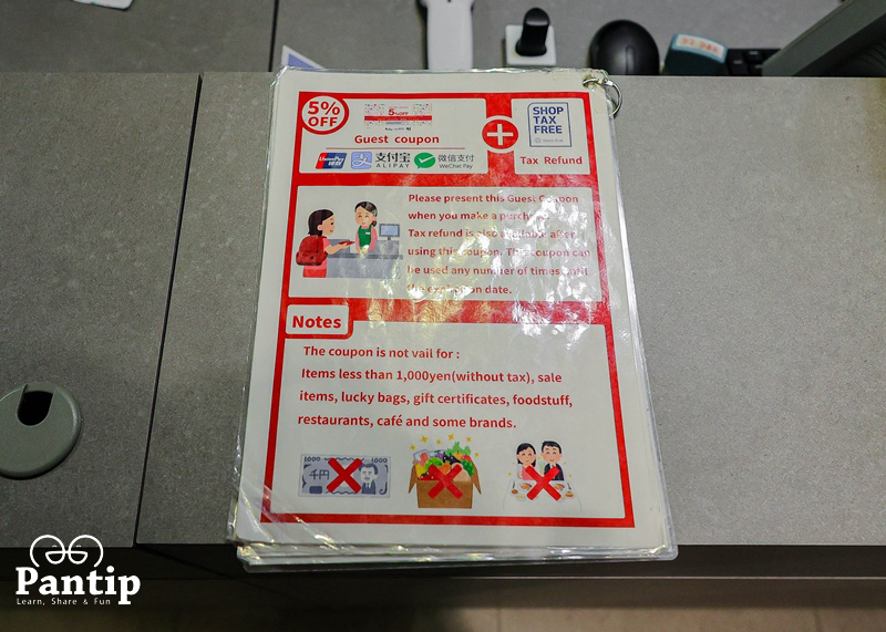 นักท่องเที่ยวผู้มีสิทธิ์ขอคืนภาษีสามารถรับคูปองส่วนลด 5% ได้ที่ร้านค้า (ต้องแสดงหนังสือเดินทางเพื่อยืนยันสิทธิ์ในการรับคูปอง)โปรดทราบว่าคูปองนี้อาจไม่สามารถใช้ได้กับร้านค้าหรือสินค้าบางรายการ กรุณาสอบถามรายละเอียดเพิ่มเติม ณ จุดขาย