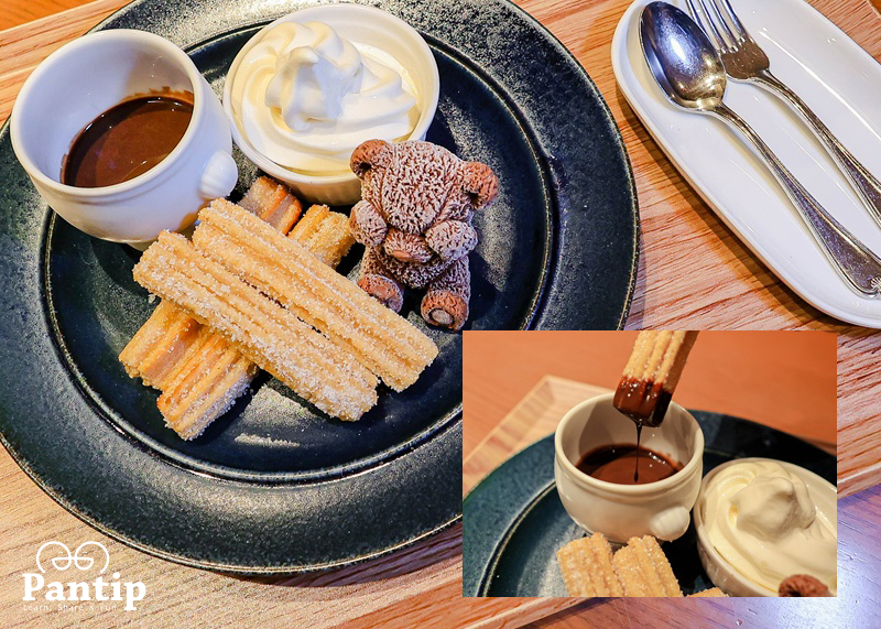 มาต่อกันที่เมนูของหวานที่เด็กๆ ชอบ อย่าว่าแต่เด็กผู้ใหญ่แบบเราเห็นก็ยังชอบ กับเมนู Bear’s churros dip เจ้าหมีตัวน้อยน่ารักภายในจาน มาพร้อมกับ ชูโรส ดริปช็อกโกแลต และไอศกรีมนมรสเข้มข้นหวานเย็นชื่นใจ