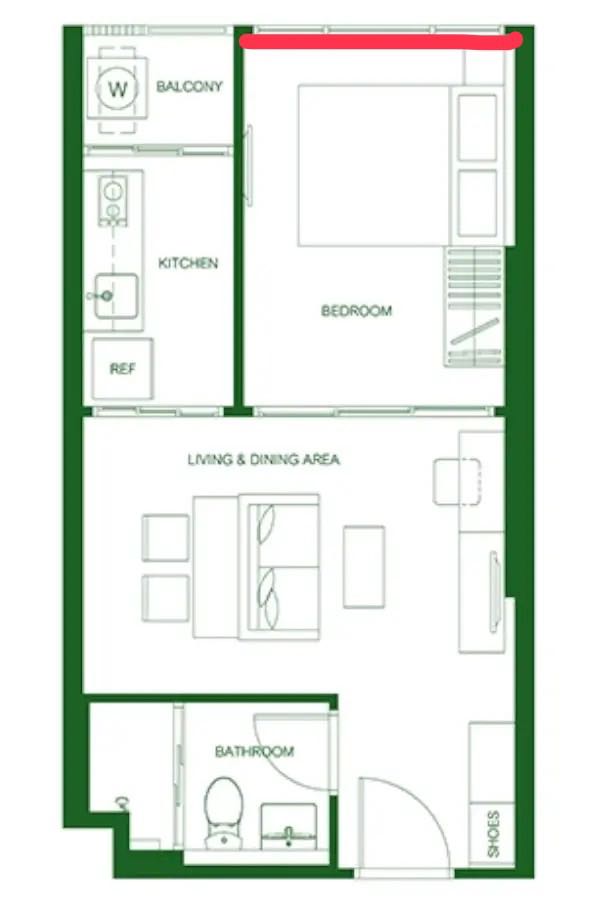 ถ้าสลับชุดโซฟาจุดวางทีวี ไปไว้ติดหน้าต่าง ตรงเส้นสีแดง แล้วสลับเตียงนอนมาอยู่ตรงกลาง ดีไหม