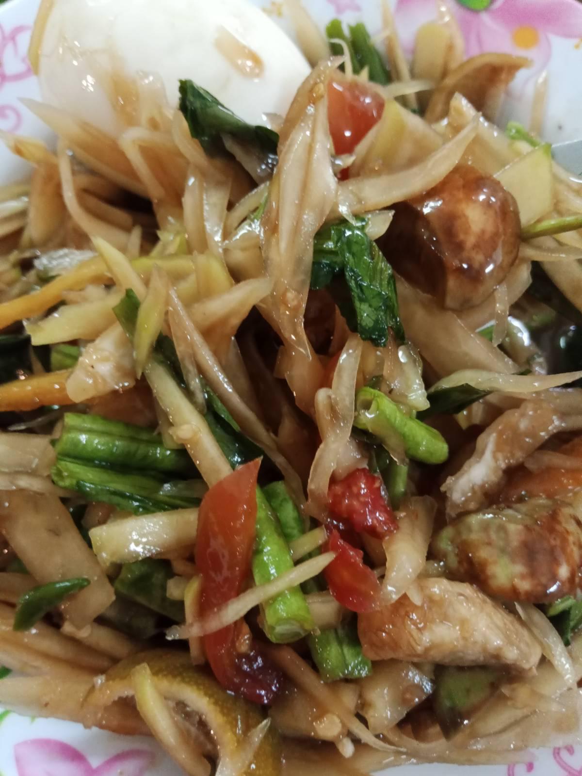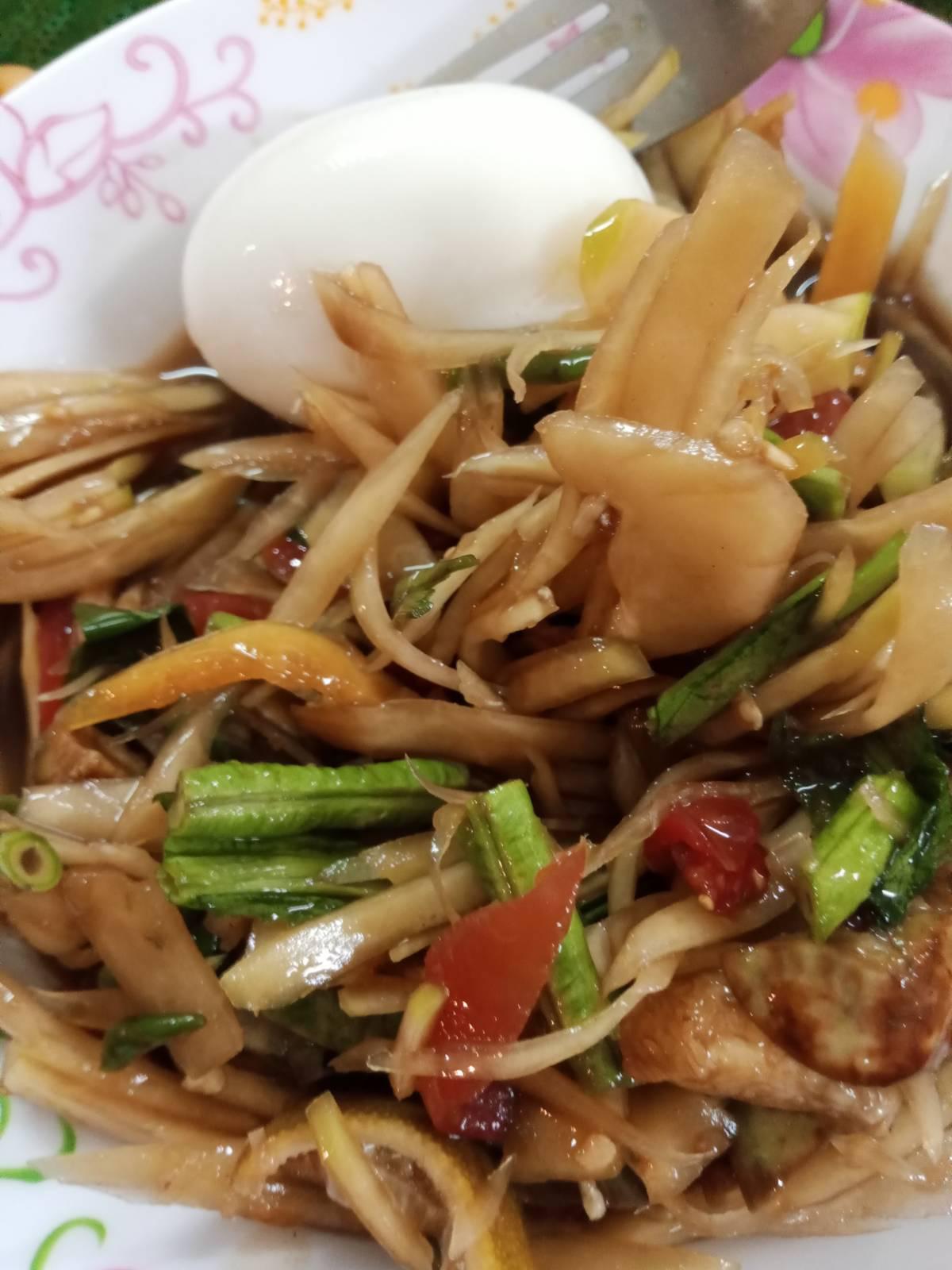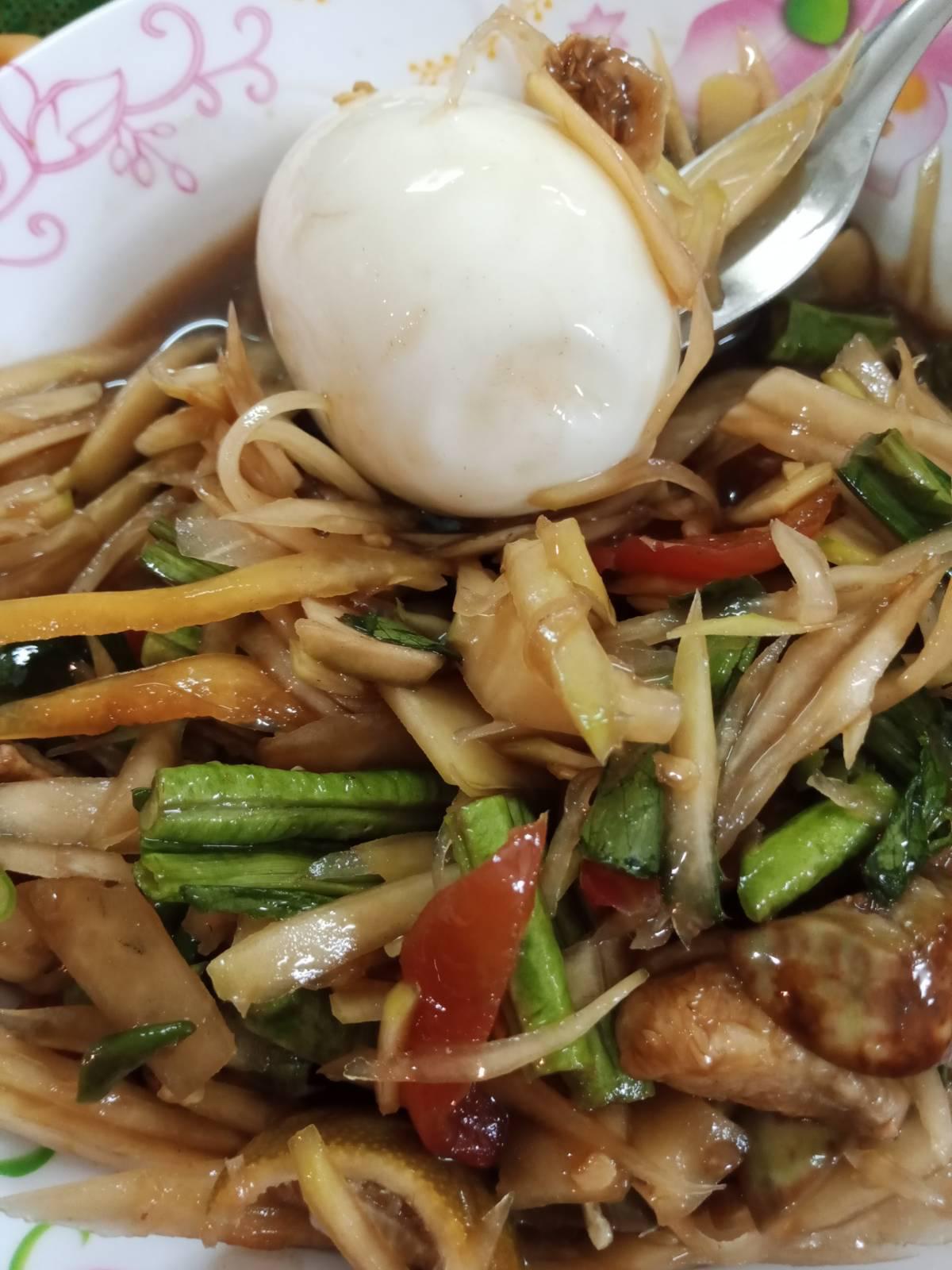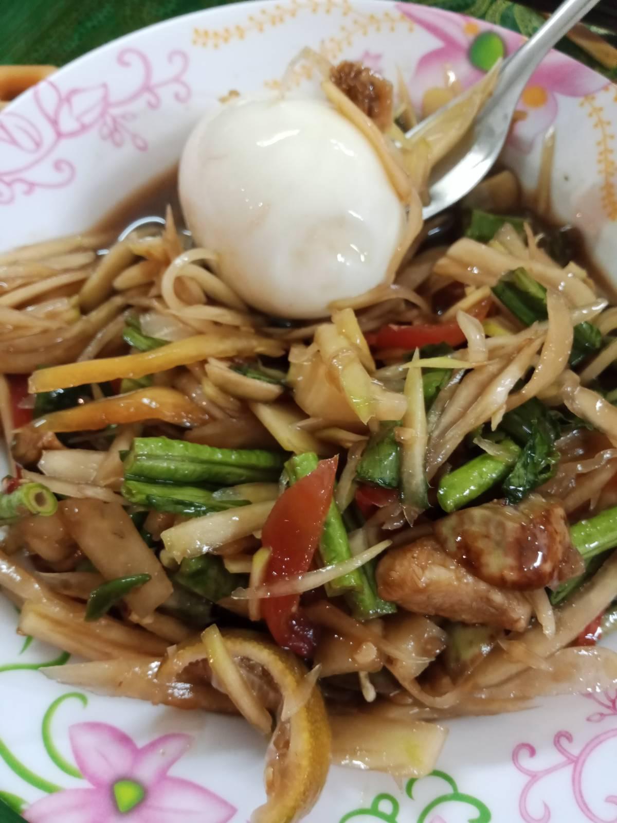 ตำปลาร้า + ขนมจีน + ไข่ต้ม รุ่นพี่เค้าลืมว่าวันนี้เริ่มกินเจแล้ว สั่งตำปลาร้าไว้ กินไม่ได้ เลยให้ผมมา ตำปลาร้านัว ๆ ลาภปากเลย ใส่ไข่ต้ม เพิ่มโปรตีนซะหน่อย มีขนมจีนแห้ง คุณภรรยาไปต้มมาให้ น็อกน