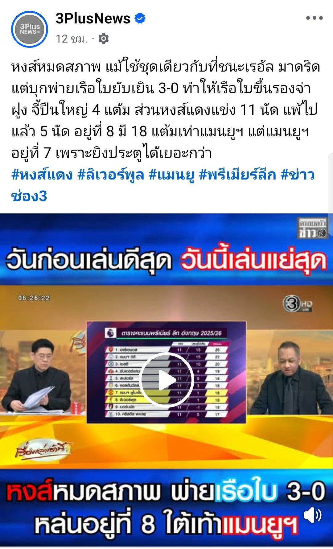 🫣 หงส์หมดสภาพ แม้ใช้ชุดเดียวกับที่ชนะเรอัล มาดริด แต่บุกพ่ายเรือใบยับเยิน 3-0