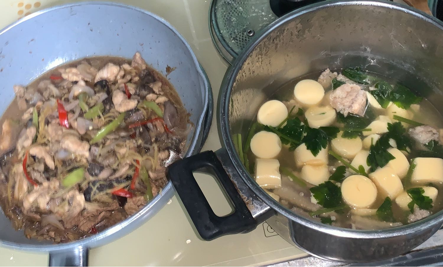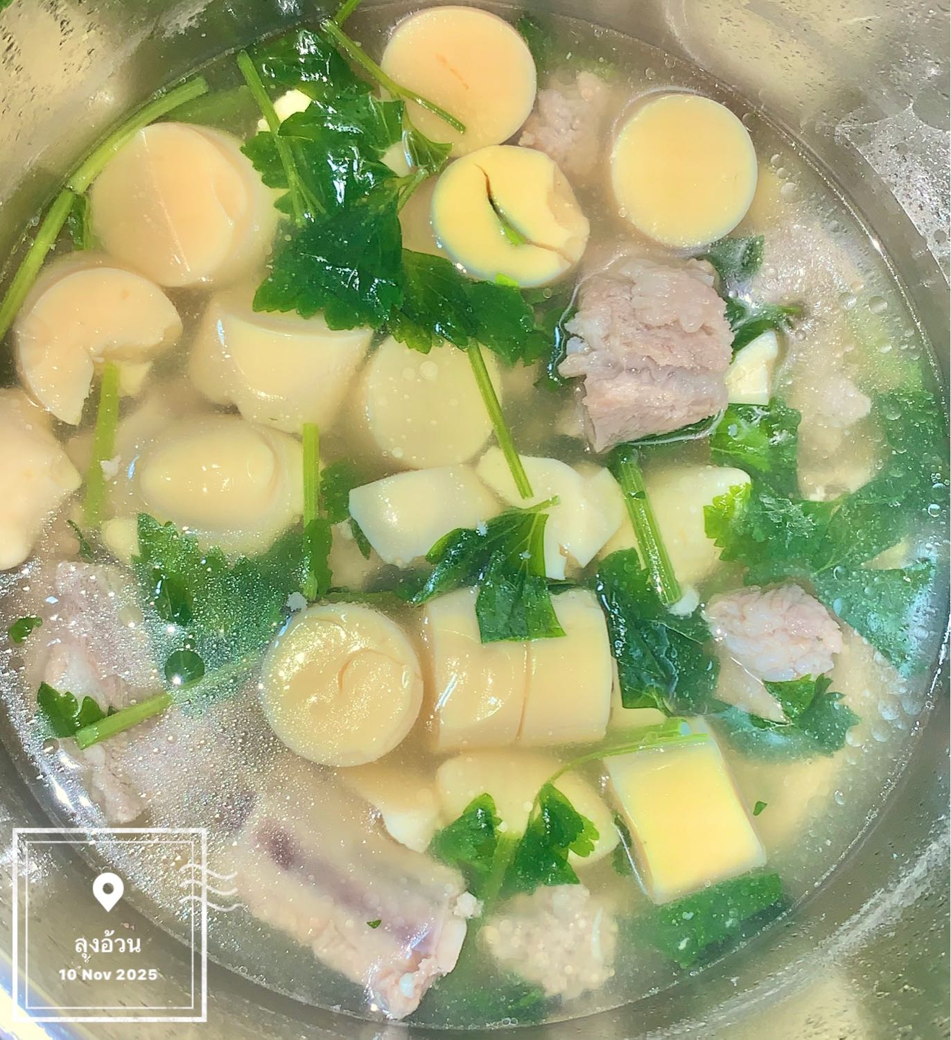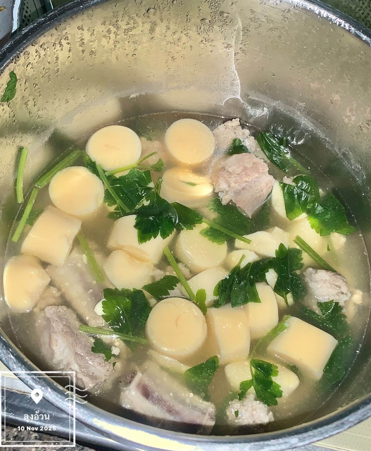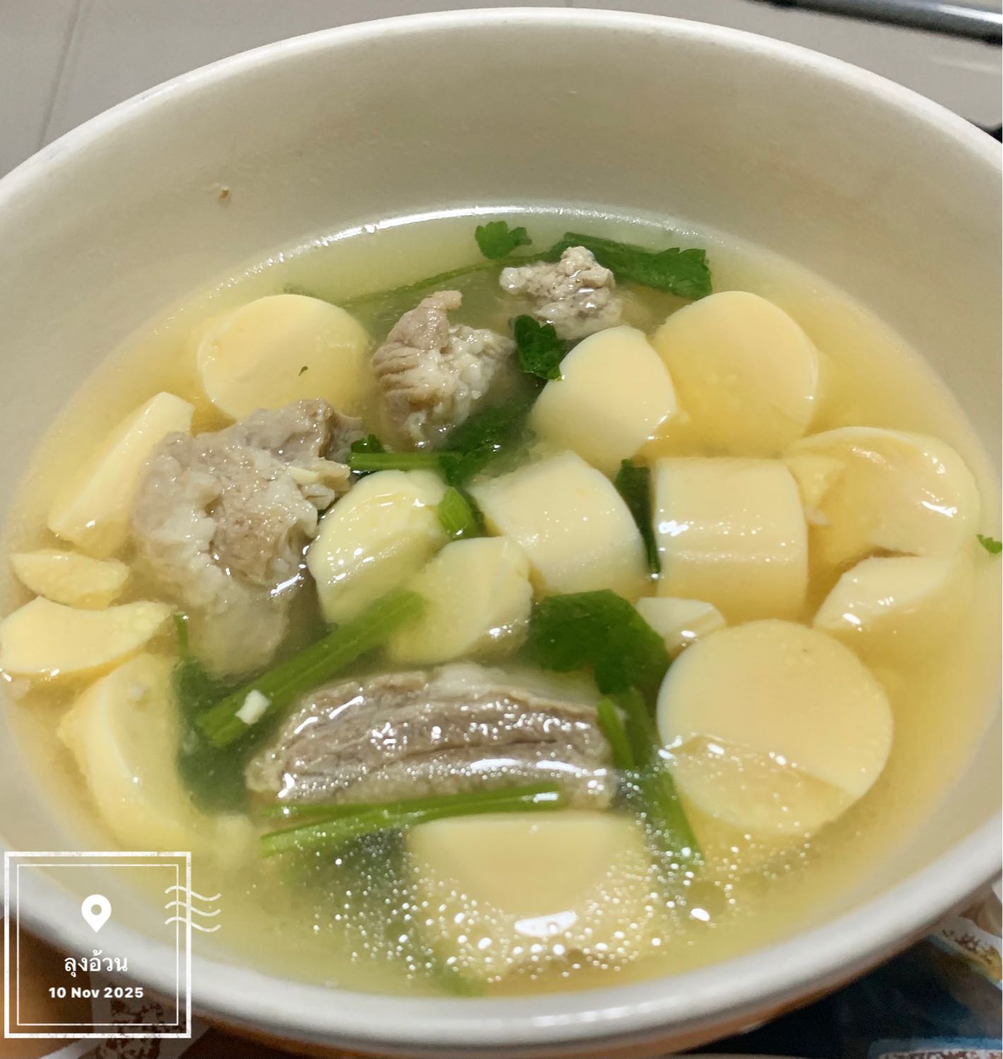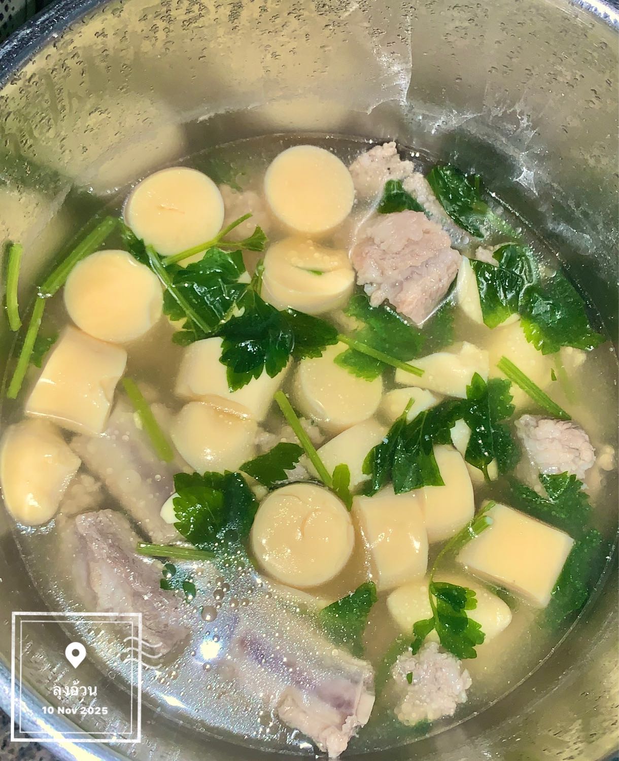 แกงจืดเต้าหู้ไข่ ต้มซี่โครงหมู ช้อนฟอง ปรุงรสซีอิ๊วขาวเห็ดหอม พริกไทยป่น รากผักชี ใส่หมูเด้งปั้น ใส่ผักขึ่นช่ายลงไป น้ำแกงจืดต้องสีใสชวนกิน