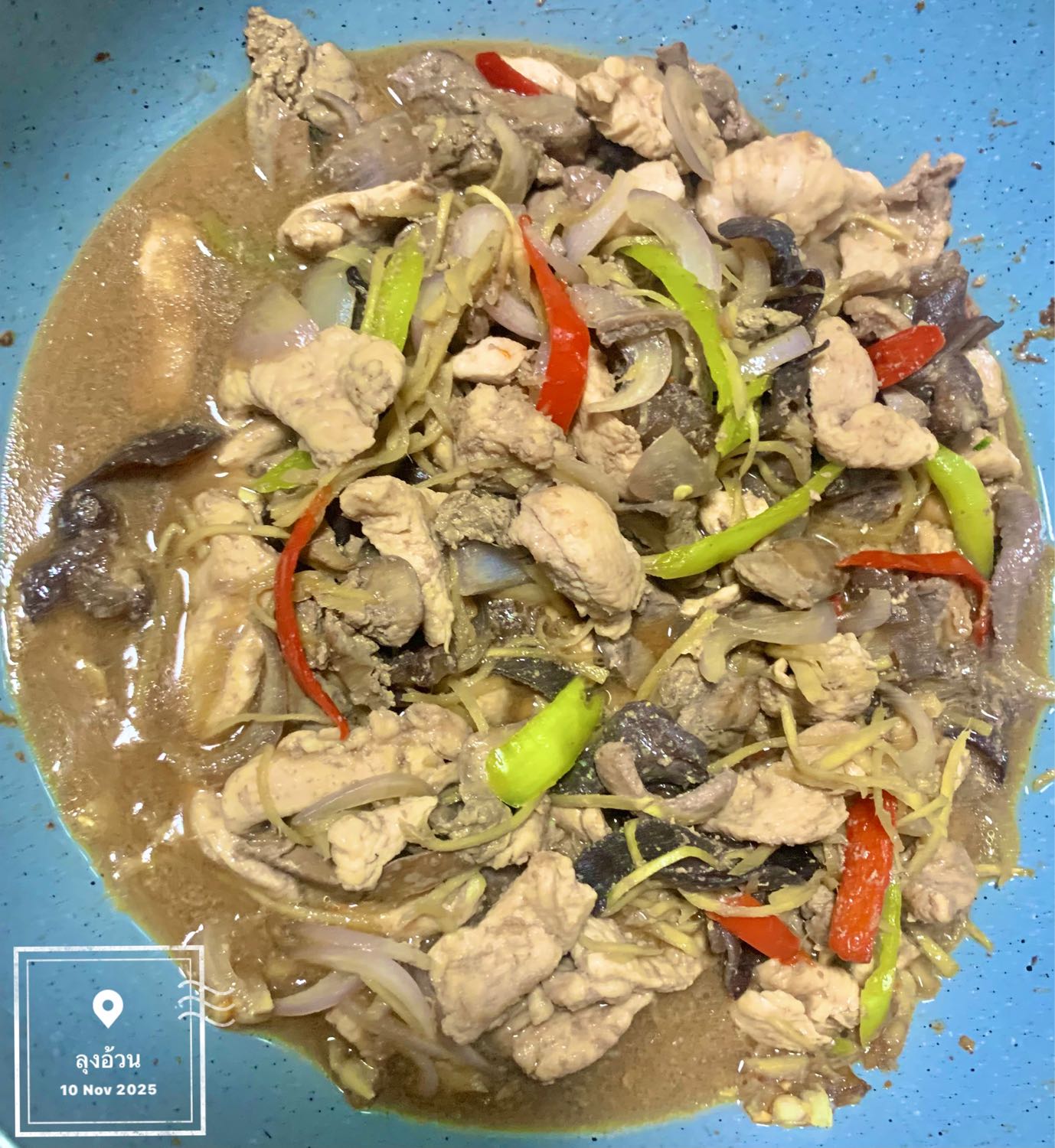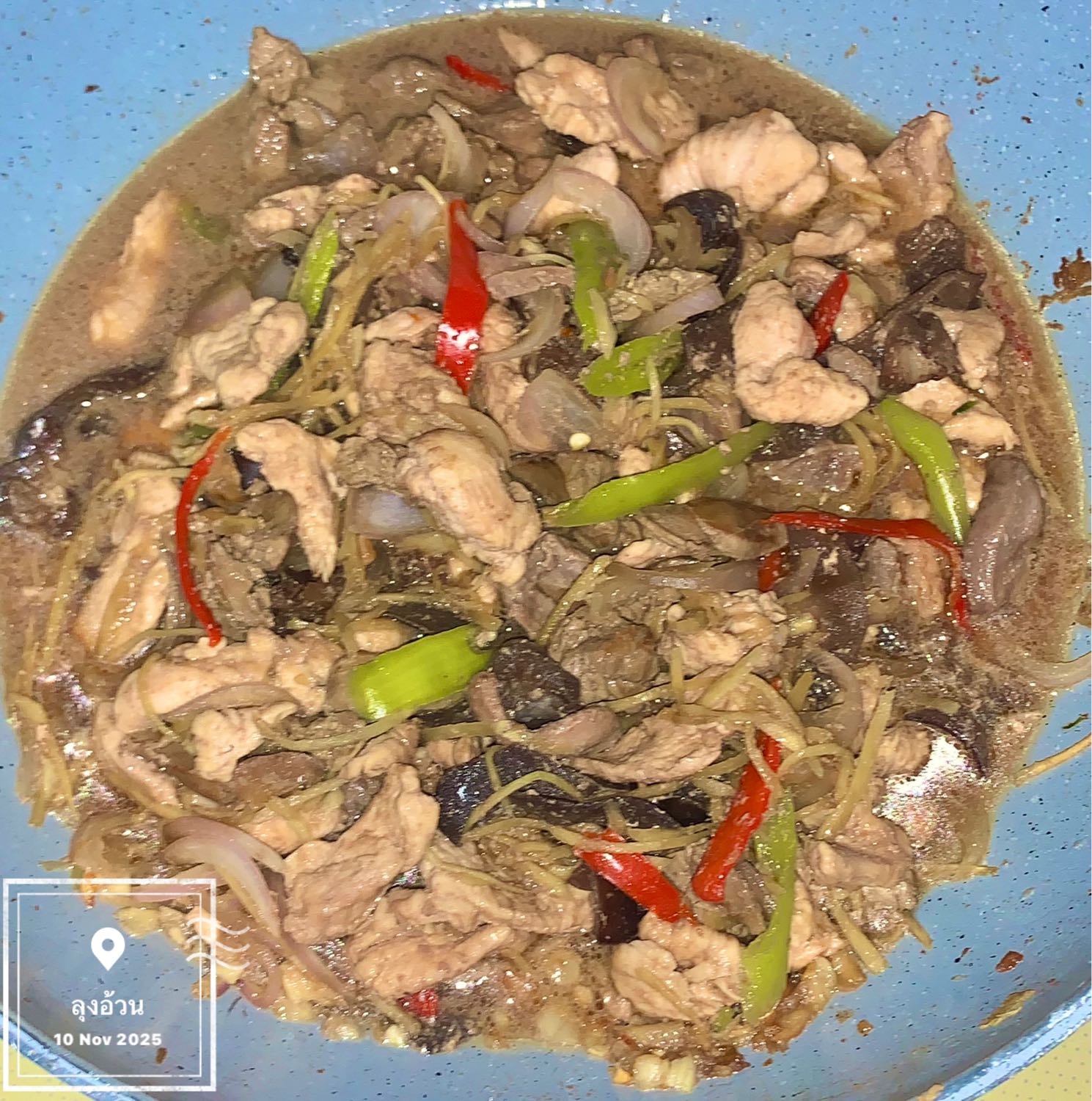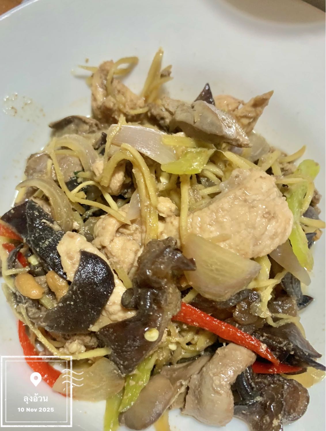 ผัดขิงไก่เครื่องในไก่ ปรุงรสด้วยเต้าเจี๊ยว และใส่ขิงซอยเยอะ ใส่หอมหัวใหญ่ ใส่เห็ดหูหนูดำ ใส่พริกขี้ฟ้าแดง ใส่กระเทียมทับ ปรุงรส ซอสหอยนางรม ย้อมสีด้วยซีอิ๊วหวาน น้ำซุปนิดหน่อย มีน้ำผัดคลุกข้าวอร่อย