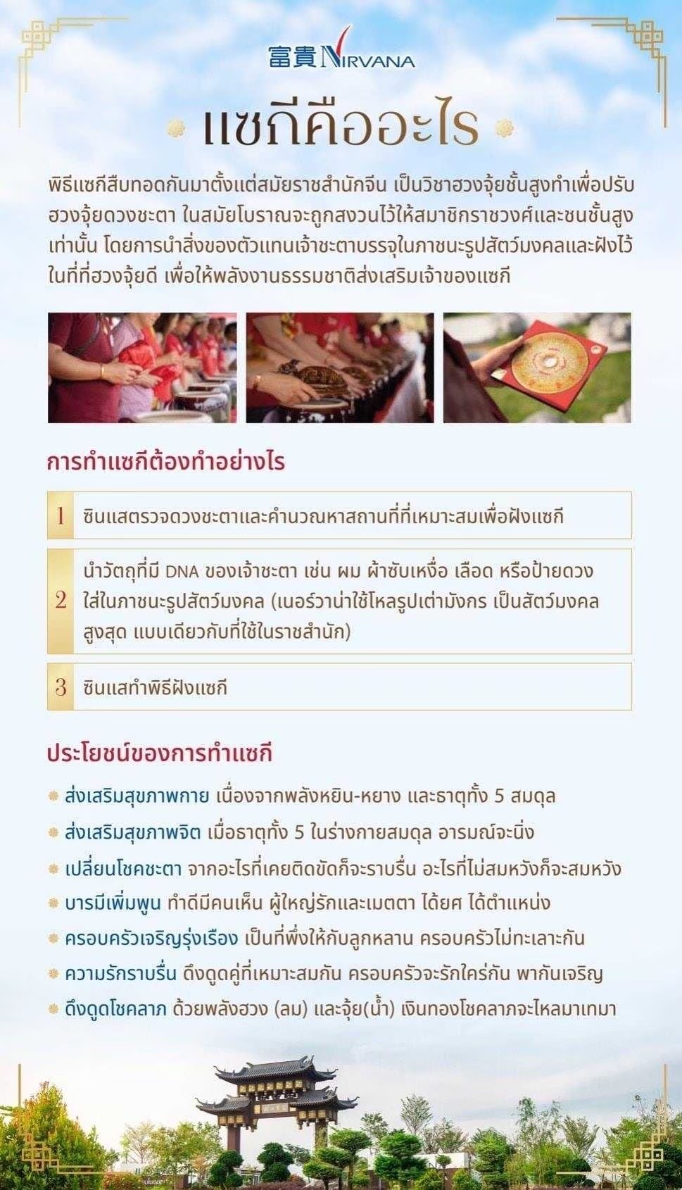 สถานที่ศักดิ์สิทธิ์: เนอร์วาน่าคือสถานที่ที่ถูกคัดสรรและออกแบบตามหลักฮวงจุ้ยชั้นสูง เพื่อให้เป็นแหล่งรวมพลังงานบริสุทธิ์ที่ดีที่สุดสำหรับการทำพิธีแซกี