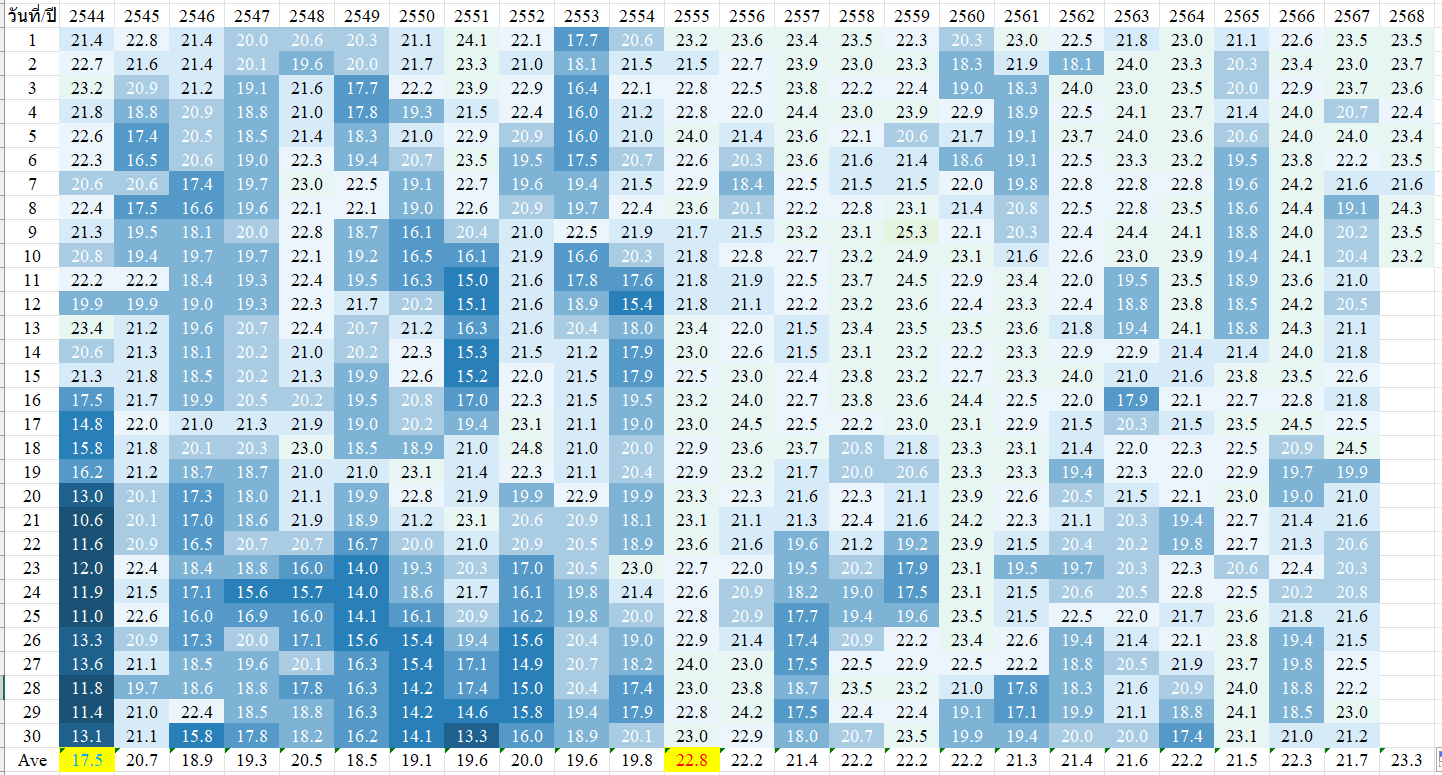 ผมนำข้อมูลมาจากกรมอุตุนิยมวิทยาไทย สถานีเมืองเชียงใหม่ และนำมาใส่ Excel เปรียบเทียบ แนวนอนคือปีพุทธศักราช แนวตั้งคือวันในเดือนพฤศจิกายน