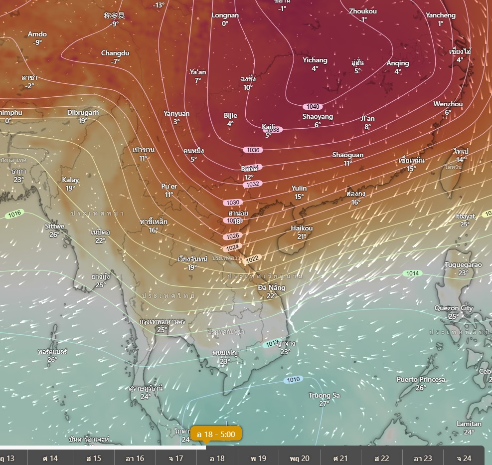 แบบจำลองของ ECMWF ล่าสุด ช่วงวันที่ 15-20 พฤศจิกายนนี้ มวลอากาศเย็นกำลังแรงระลอกแรกของปีนี้จะแผ่ลงมา เส้นความกดอากาศตัวท็อปอย่าง 1015-1020 ก็ลงมาเที่ยวประเทศไทยตั้งแต่ต้นฤดูหนาวกันเลยทีเดียว และลมตะวันออกเฉียงเหนือก็พัดแรงมาก ภาคอีสานน่าจะ 15-30 กิโลเมตรต่อชั่วโมง เต็นท์ปลิวกันแน่งานนี้