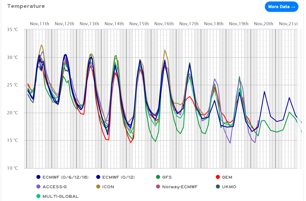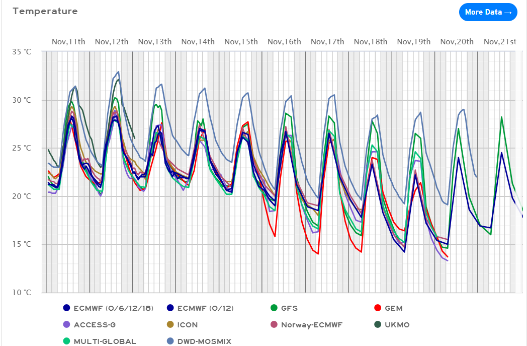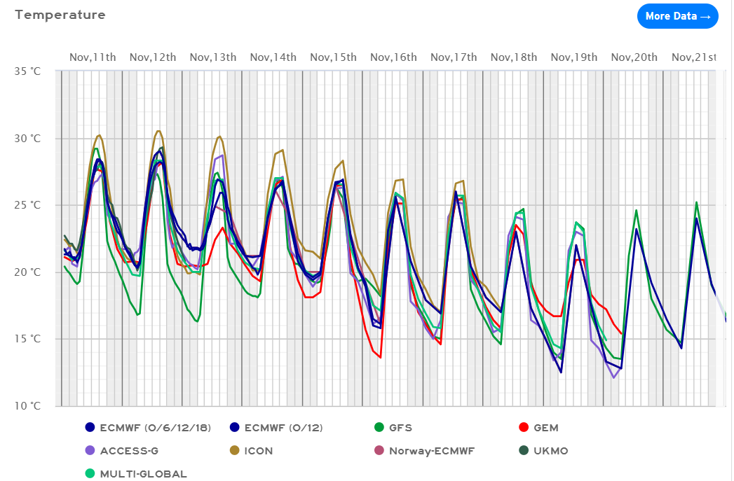 หลาย ๆ แบบจำลองนั้นก็ให้ผลที่แตกต่างกันออกไป แต่ช่วงวันที่ 15-18 นั้น แบบจำลองมีแนวโน้มไปในทางเดียวกัน ว่าอำเภอเมืองเชียงใหม่อุณหภูมิจะลดลงไม่น้อยกว่า 2-4 องศาเซลเซียส ประมาณ 17-20 องศาเซลเซียส