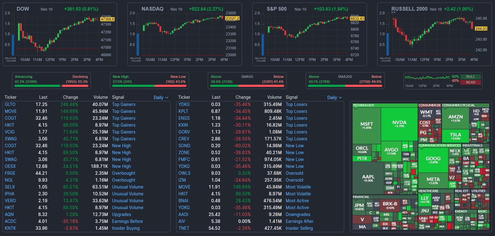 ตลาดหุ้นสหรัฐฯ ปิดการซื้อขายด้วยการปรับตัวขึ้นอย่างแข็งแกร่ง โดยได้รับแรงหนุนจากหุ้นในกลุ่มเทคโนโลยีและปัญญาประดิษฐ์ (AI) ขนาดใหญ่ อาทิ Nvidia, Palantir และ Tesla หลังจากสัญญาณความคืบหน้าในสภาคองเกรสสหรัฐฯ ที่อาจนำไปสู่การยุติ “ภาวะชัตดาวน์” ของรัฐบาลกลางซึ่งยืดเยื้อมายาวนานที่สุดในประวัติศาสตร์ประเทศ