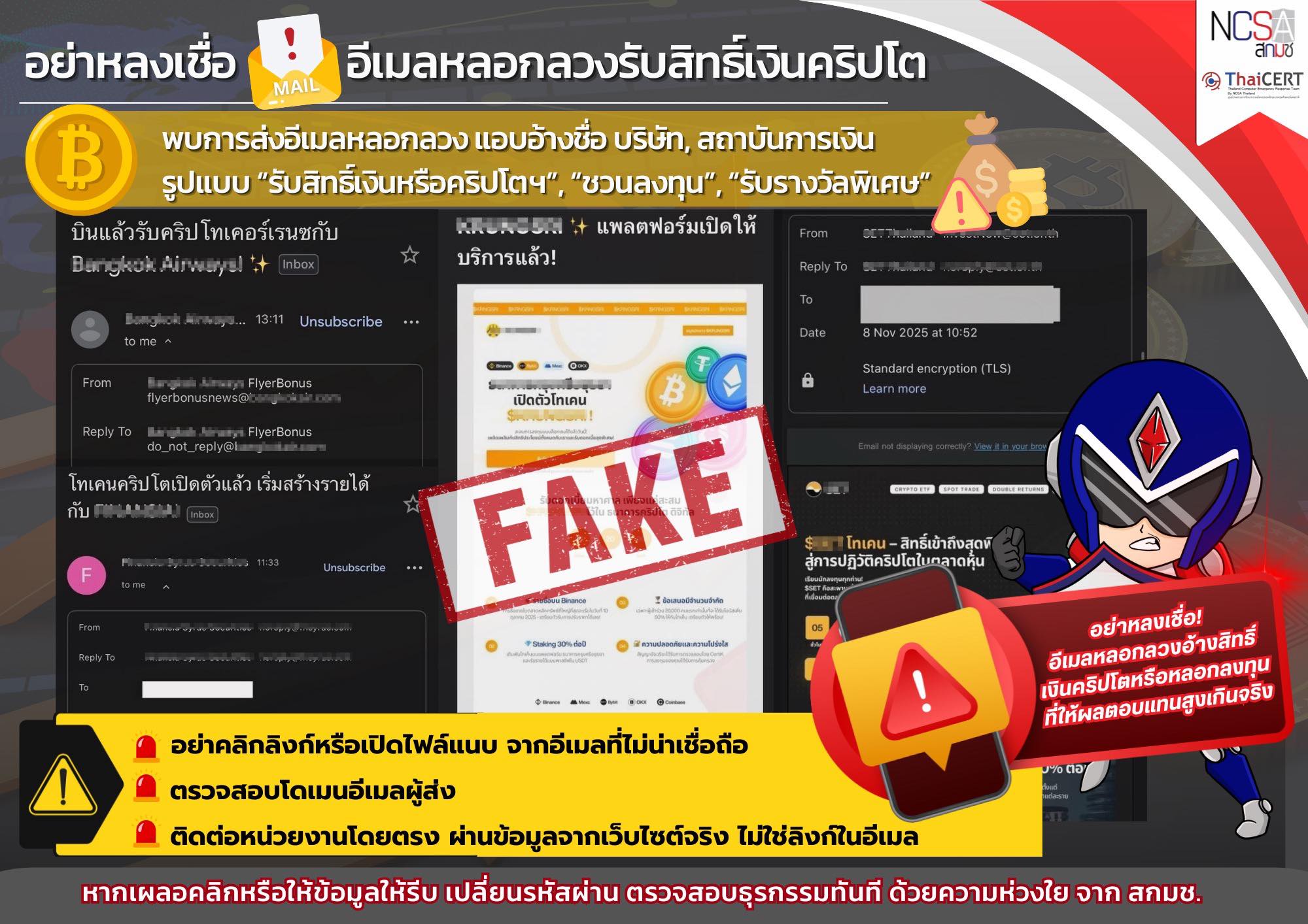 สกมช.แจ้งเตือน อย่าหลงเชื่อ! อีเมลหลอกลวงรับสิทธิ์เงินคริปโต หรือ ชักชวนลงทุน
