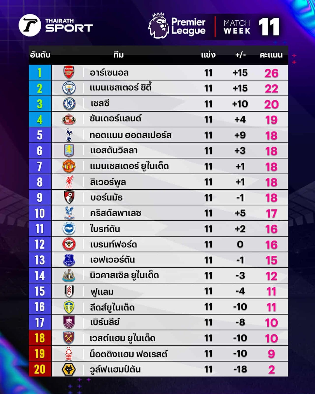 ตามมาด้วยอันดับ 3 เชลซี มี 20 คะแนน, อันดับ 4 ซันเดอร์แลนด์ 19 คะแนน และอันดับ 5 ท็อตแน่ม ฮอตสเปอร์ มี 18 คะแนน