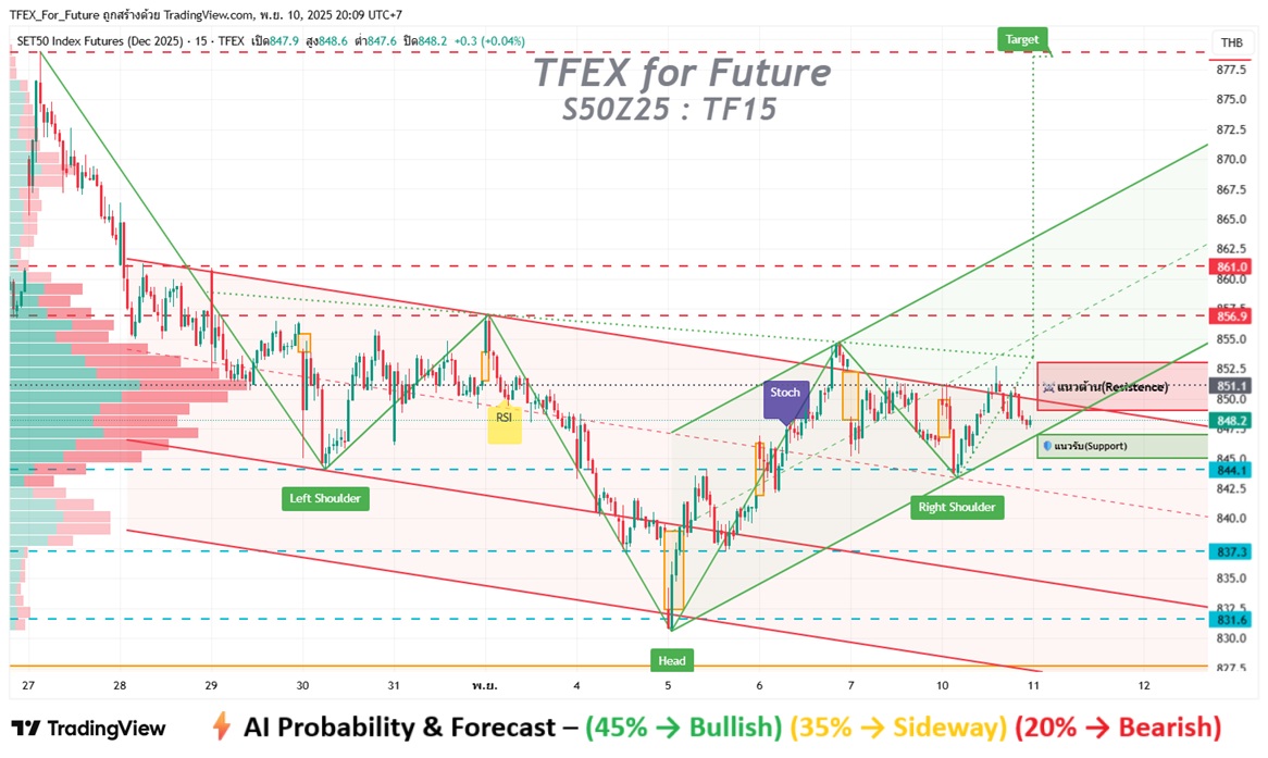 🔹 35% → Sideway Consolidation (แกว่ง 845–853)