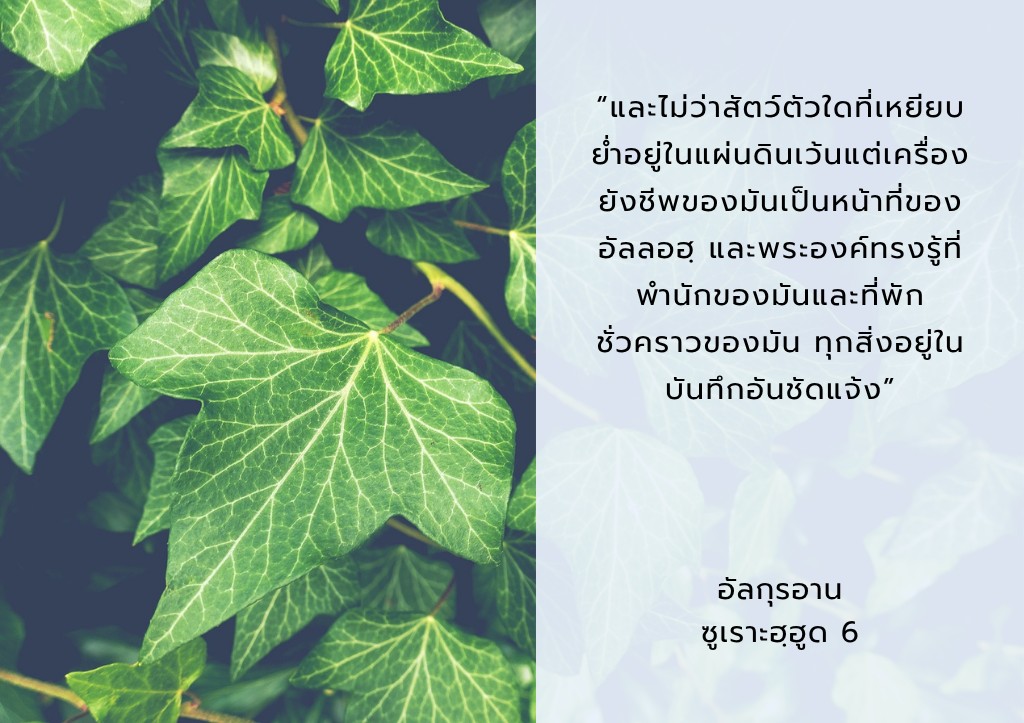 – “และไม่ว่าสัตว์ตัวใดที่เหยียบย่ำอยู่ในแผ่นดินเว้นแต่เครื่องยังชีพของมันเป็นหน้าที่ของอัลลอฮฺ และพระองค์ทรงรู้ที่พำนักของมันและที่พักชั่วคราวของมัน ทุกสิ่งอยู่ในบันทึกอันชัดแจ้ง” (อัลกุรอาน ซูเราะฮฺฮูด 6)