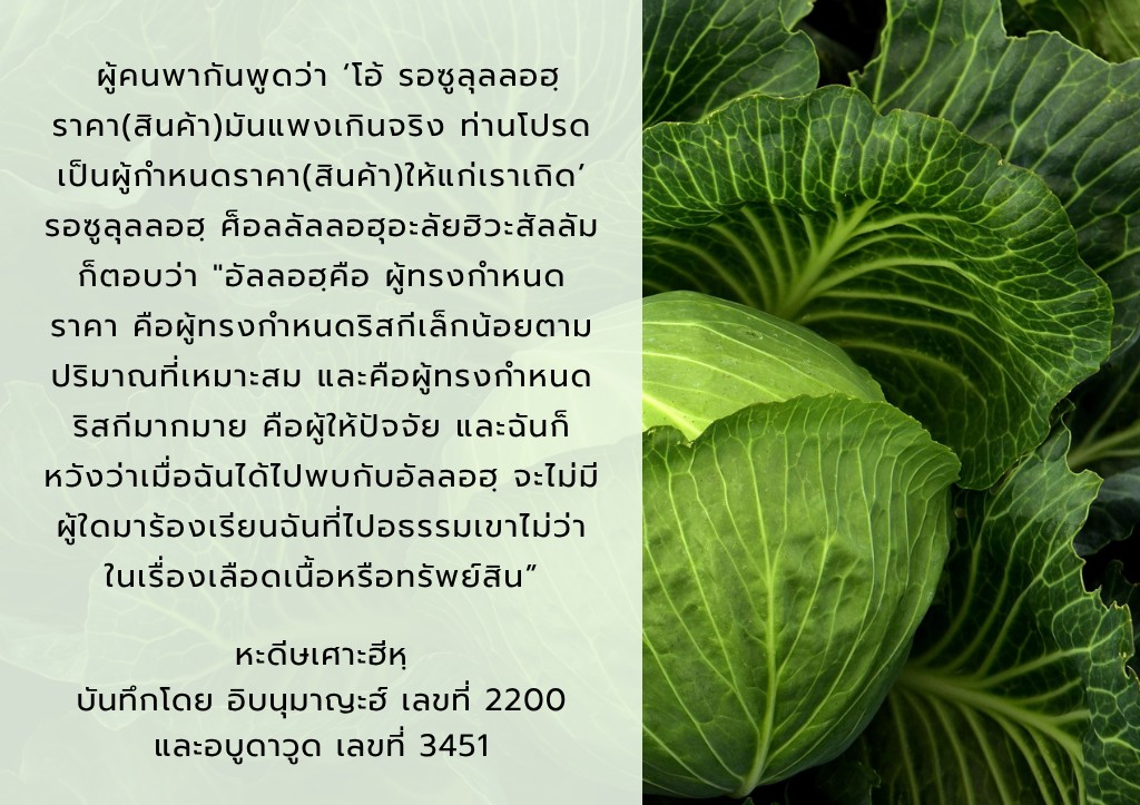 – ผู้คนพากันพูดว่า ‘โอ้ รอซูลุลลอฮฺ ราคา(สินค้า)มันแพงเกินจริง ท่านโปรดเป็นผู้กำหนดราคา(สินค้า)ให้แก่เราเถิด’ รอซูลุลลอฮฺ ศ็อลลัลลอฮุอะลัยฮิวะสัลลัม ก็ตอบว่า “อัลลอฮฺคือ ผู้ทรงกำหนดราคา คือผู้ทรงกำหนดริสกีเล็กน้อยตามปริมาณที่เหมาะสม และคือผู้ทรงกำหนดริสกีมากมาย คือผู้ให้ปัจจัย และฉันก็หวังว่าเมื่อฉันได้ไปพบกับอัลลอฮฺ จะไม่มีผู้ใดมาร้องเรียนฉันที่ไปอธรรมเขาไม่ว่าในเรื่องเลือดเนื้อหรือทรัพย์สิน” (หะดีษเศาะฮีหฺ บันทึกโดย อิบนุมาญะฮ์ เลขที่ 2200 และอบูดาวูด เลขที่ 3451)
