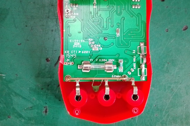 จุดที่ไหม้คือจุดบัดกรี Shunt Resistor ผมแก้ไขโดยการบัดกรีสายไฟเข้าแผ่นปริ๊นโดยตรงก็ใช้ได้ ผมคิดที่จะโมดิฟายด์ให้ VoIt Amp Meter ตัวนี้รองรับกระแสได้มากขึ้นโดยใช้ Shunt Resistor กระแสสูงจึงค้นหาตามร้านค้าออนไลน์พบว่าเขาระบุแต่พิกัดกระแส 100A นอกนั้นไม่ระบุอะไรมาเลย ถ้าใช้ Shunt Resistor ที่ไม่รู้ค่าความต้านทานและแรงดันตกคร่อมส่วนของ Amp Meter ก็จะผิดเพี้ยนเชื่อถือไม่ได้ผมจึงไม่ซื้อตอนนี้ใช้ฟิวส์ขนาด 25A ขนานกับ Shunt Resistor ไปพลางๆ ก่อนป้องกันไม่ให้ไหม้เสียหายอีก เมื่อใช้ฟิงส์ขนานกระแสที่โชว์จึงไม่ใช่กระแสจริงต้องใช้แคล้มป์มิเตอร์วัดจึงจะรู้พิกัดกระแสที่ไหลในวงจร