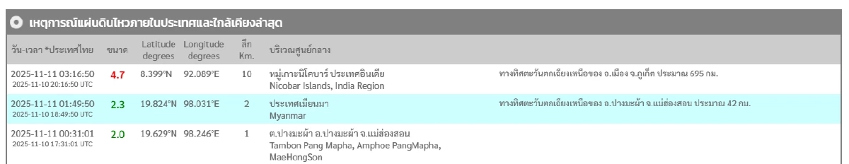 11 พ.ย. 68 เหตุการณ์แผ่นดินไหวภายในประเทศและใกล้เคียงล่าสุด