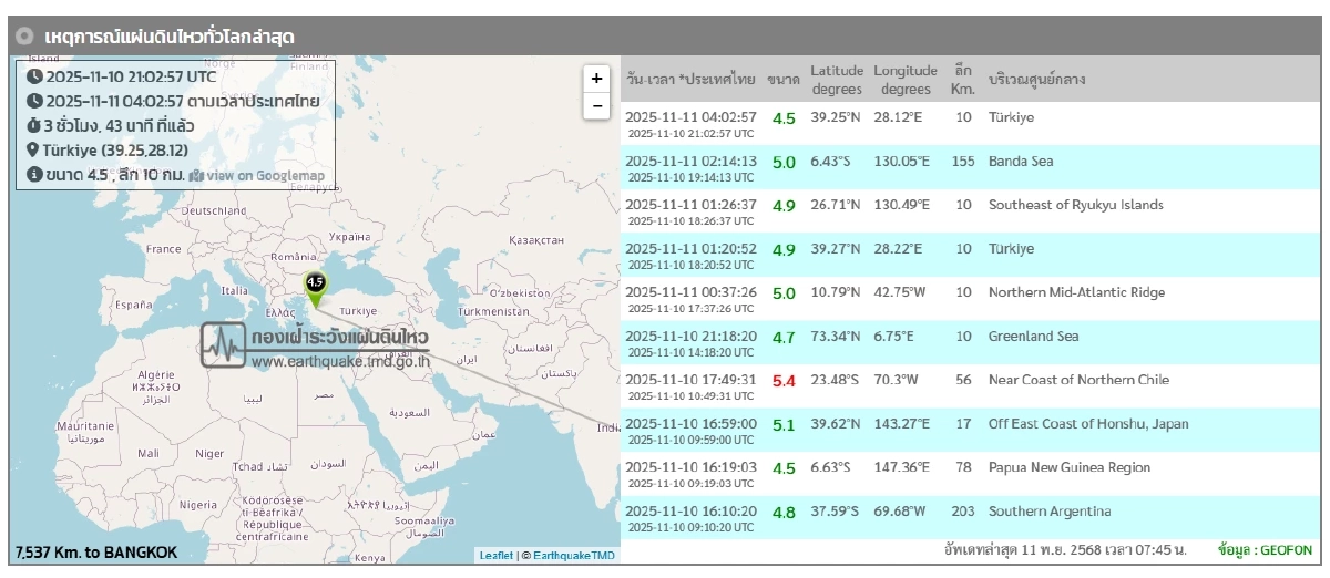 "กองเฝ้าระวังแผ่นดินไหวประเทศไทย" วันนี้ เปิดข้อมูล "แผ่นดินไหว" วันที่ 11 พฤศจิกายน 2568 สะเทือนหลายรอบ สถานการณ์ทั่วโลกยังเขย่าไหวต่อเนื่อง ประเทศไทยพบใกล้จุดศูนย์กลางอีกครั้ง