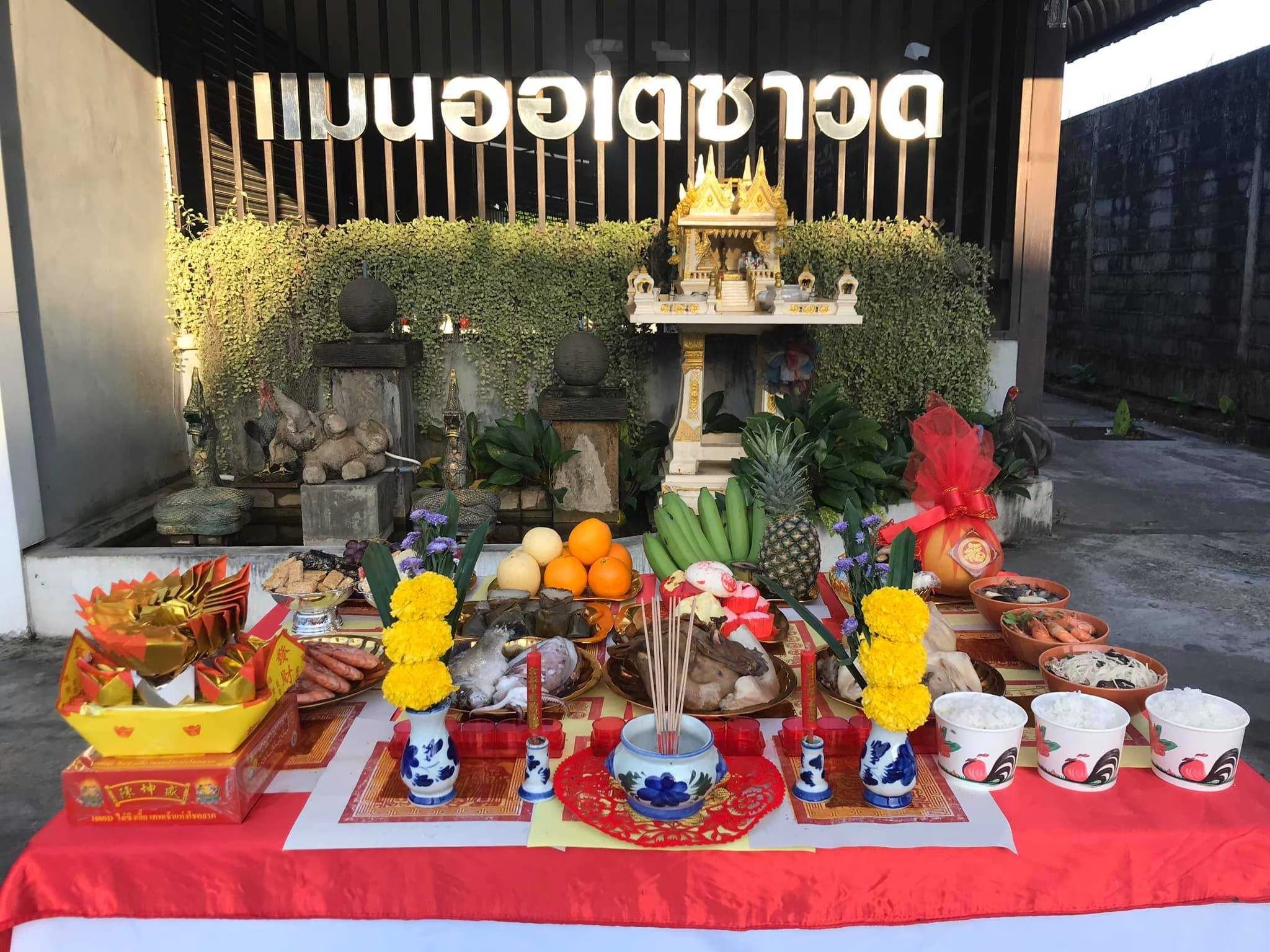 จัดเครื่องบวงสรวงครบชุด: ผลไม้ 9 อย่าง, พานบายศรี, ดอกไม้, ธูปเทียน, อาหารคาวหวาน, เหล้า, ขนมมงคล