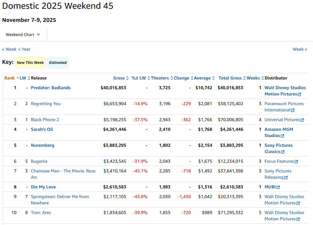 1. Predator: Badlands / ทำรายได้เปิดตัวไป 40.02 ล้านเหรียญ สูงที่สุดในแฟรนไชส์ Predator มากกว่าทั้ง Predator (1987) ที่เปิดตัว 12.03 ล้านเหรียญ Predator 2 (1990) ที่เปิดตัว 8.78 ล้านเหรียญ Predators (2010) ที่เปิดตัว 24.76 ล้านเหรียญ The Predator (2018) ที่เปิดตัว 24.63 ล้านเหรียญ รวมทั้งได้เกรด CinemaScore = A- ทำให้คาดว่าจะทำเงินยืนระยะได้ดีในอนาคต