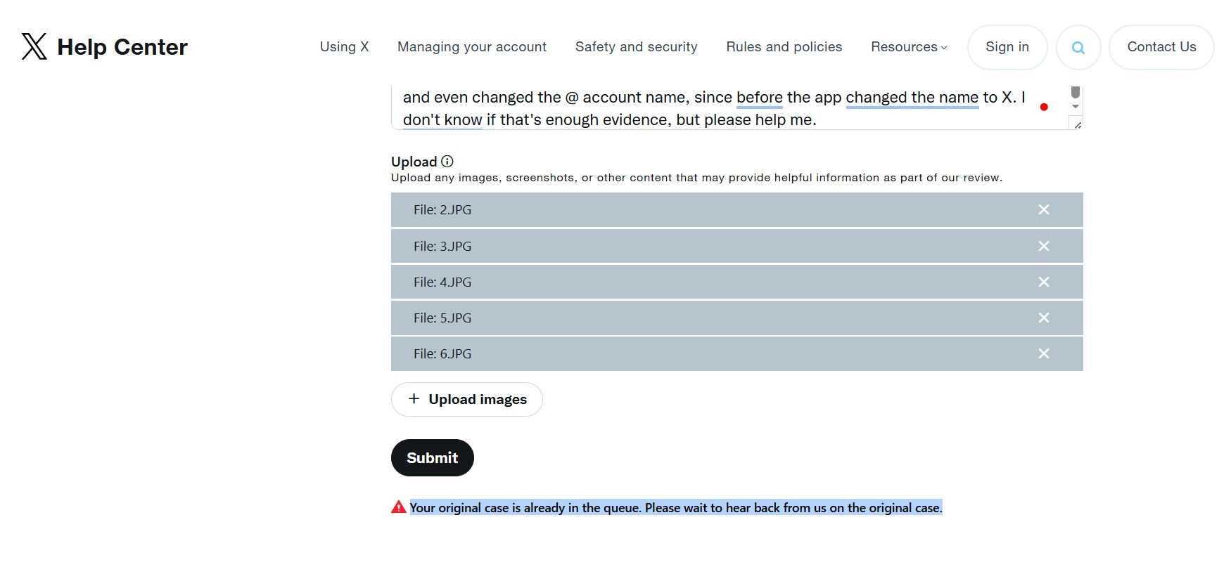 พอจะส่งเรื่องอีกครั้งโดยอาจยื่นหลักฐานมีรูปภาพกล่องข้อความอีเมลที่มีการ log in หรือทำการเปลี่ยนแปลง ตั้งแต่สมัยยังเป็น twiiter จนมาถึง X เราไม่รู้ว่าจะส่งอะไรไปเป็นหลักฐานเพียงพอ