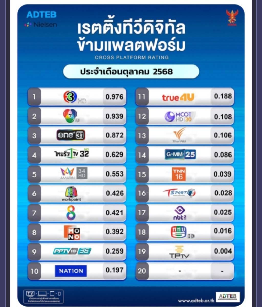 📌 เรตติ้งทีวีดิจิทัลข้ามแพลตฟอร์ม ประจำเดือนตุลาคม 2568 🏆 อันดับ 1 คือ ช่อง 3 - 0.976 🎉🎉🎉