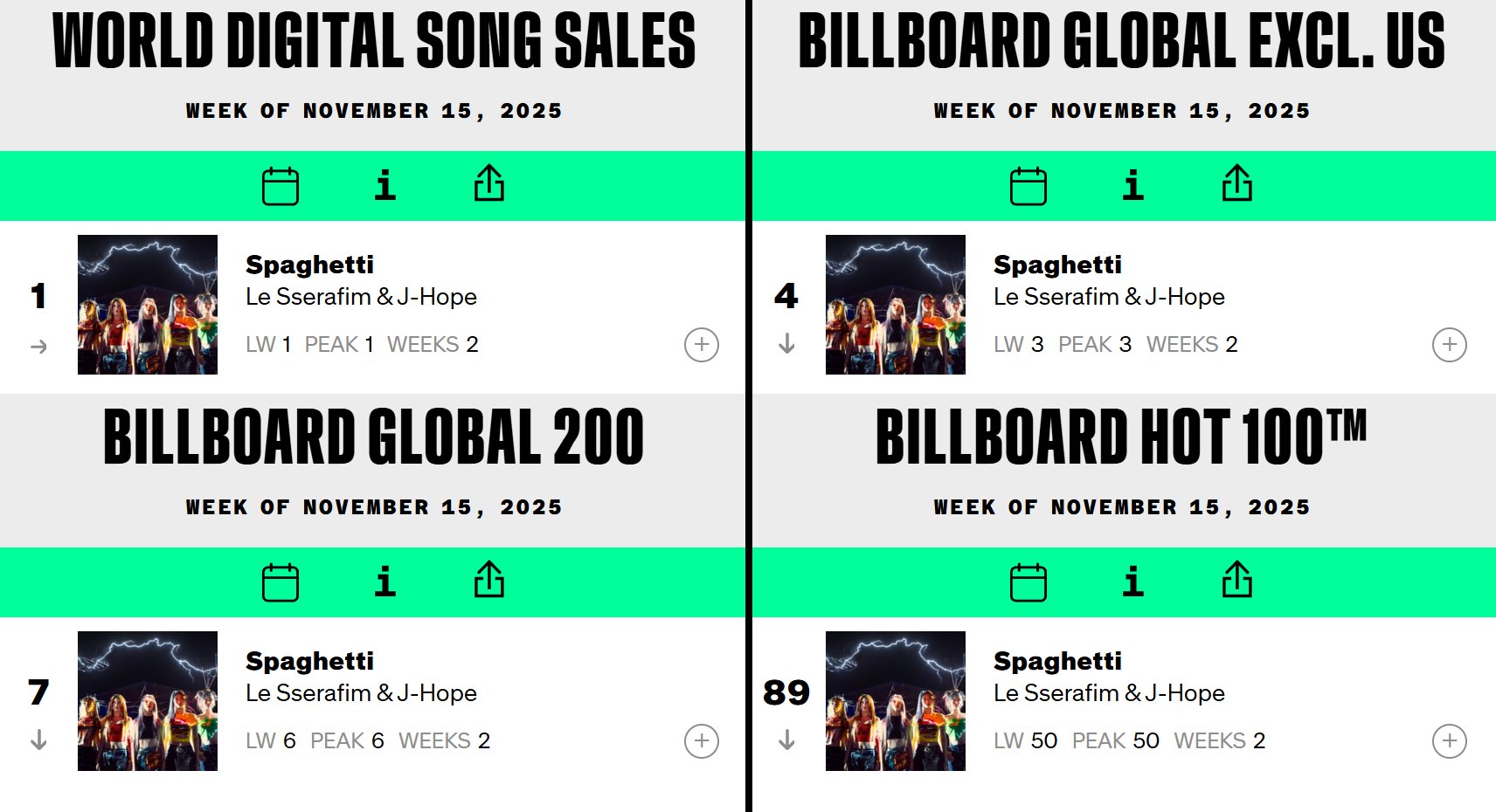 LE SSERAFIM "SPAGHETTI (feat. j-hope)" อยู่อันดับที่ #1 บนชาร์ต Billboard World Digital Song Sales เป็นสัปดาห์ที่ 2 🍝
