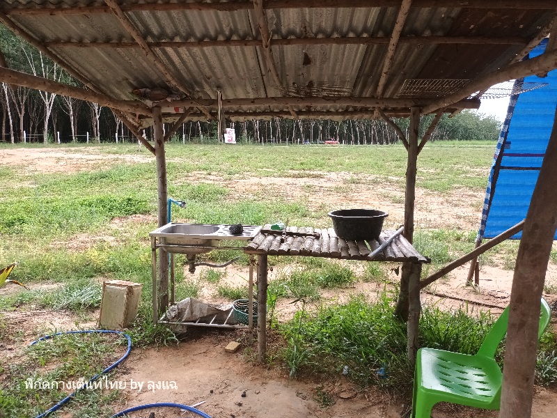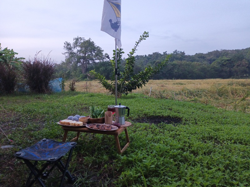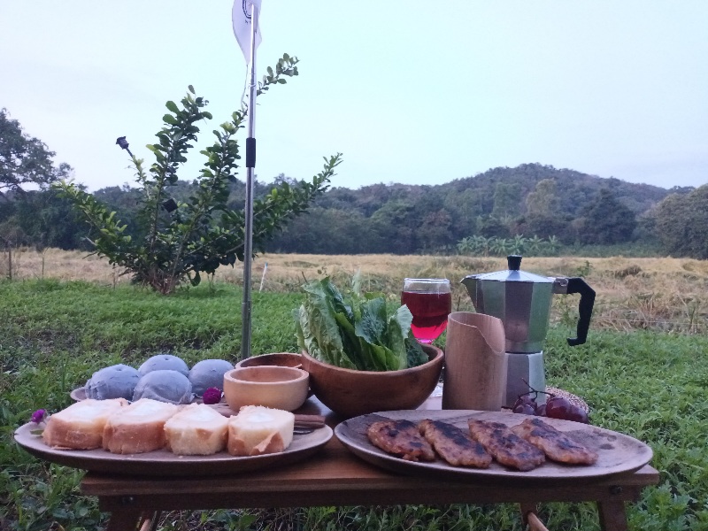 ยกออกมานั่งทำทรงหน้าเต็นท์ มีนาข้าวเป็นวิวห้องอาหาร เสียดายกอข้าวล้มจากแรงลมและฝน เห็นใจพี่น้องชาวนาเลยครับ
