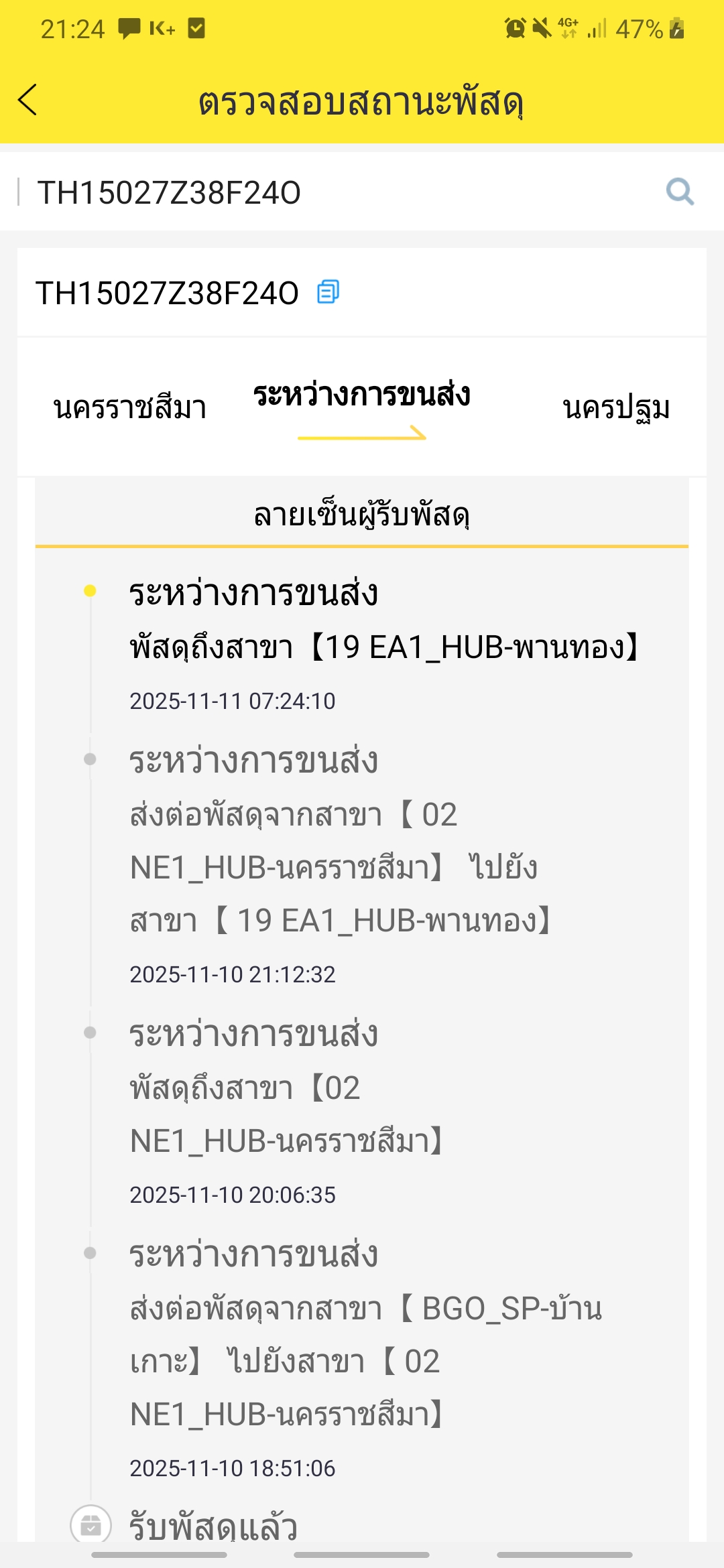 พัสดุของเราค้างอยู่ที่พานทองชลบุรีค่ะไม่รู้จะส่งมากำแพงแสนเมื่อไหร่ทั้งๆที่างจากนครราชสีมา-นครปฐมทำไมต้องไปยันพานทองแอบสงสัยนิดๆค่ะแล้วพัสดุค้างที่พานทองชลบุรีแบบนี้แก้ไขทำยังไงได้บ้างคะอย่กได้พัสดุเร็วๆค่ะทุกคน เลขพัสดุ TH15027Z38F24O