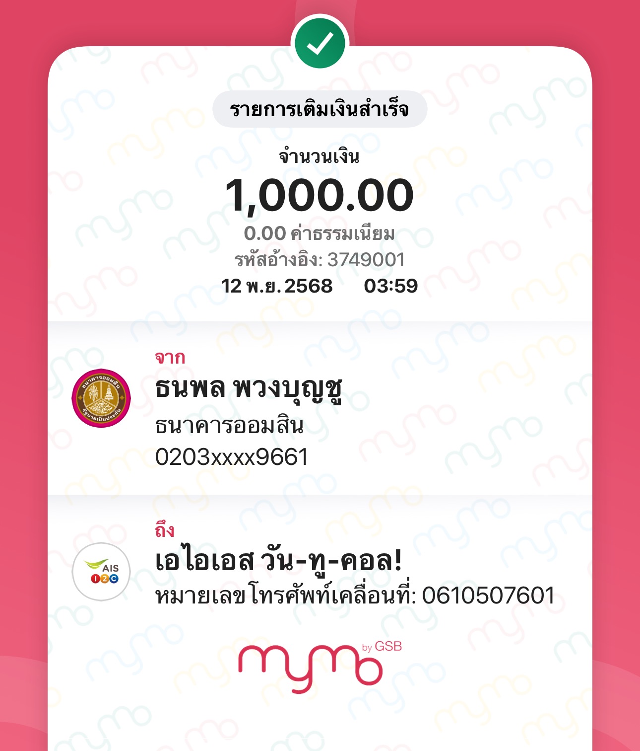 ในวันที่9 พฤศจิกายน 2568 เวลา 14:24:11 ผมได้เติมเงินมือถือผ่านแอพเป๋าตังแล้วทีนี้เงินยังไม่เข้าซิมaisของผมเป็นจำนวนเงิน20บาทถ้วน ควรแจ้งที่ใครดีหรือติดต่อฝ่ายไหนได้ครับ จนถึงตอนนี้ 20:31 ยังไม่มีเงินเ