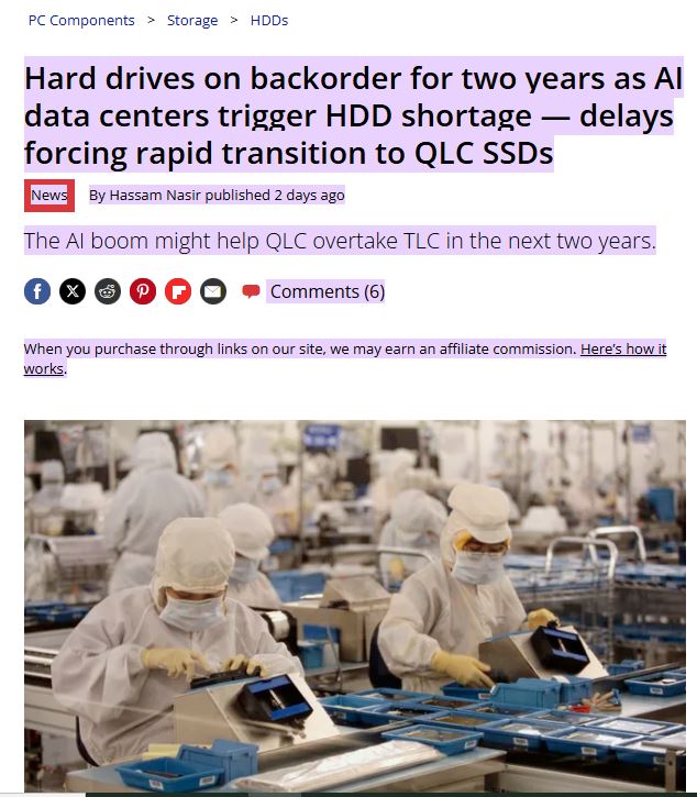 การแข่งขันเพื่อบรรลุ AGI (ปัญญาประดิษฐ์ทั่วไป) ได้ผลักดันให้ผู้ผลิตต่างๆ ลงทุนและสร้างศูนย์ข้อมูลในอัตราที่สูงกว่าศักยภาพของเราอย่างมาก ผู้ผลิตกำลังดิ้นรนเพื่อให้ทันกับความต้องการ AI และการขาดแคลน DRAM อย่างต่อเนื่องก็เป็นเครื่องพิสูจน์สิ่งนี้ โดยชุดหน่วยความจำมีราคาสูงกว่าสองเท่าของราคาเมื่อไม่กี่เดือนก่อน ปัจจุบันDigiTimesรายงานว่าระบบจัดเก็บข้อมูลก็ได้รับผลกระทบเช่นกัน โดยระยะเวลาการจัดส่ง HDD ระดับ องค์กรล่าช้าไปสองปี