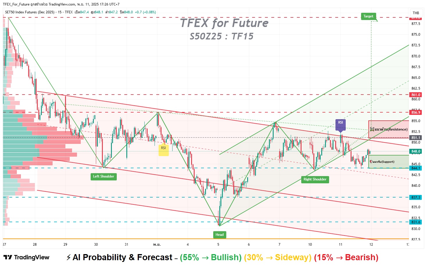 หากทะลุ 850 และยืนได้อย่างน้อยครึ่งวัน จะเป็นสัญญาณบวก → เปิดทางไปทดสอบ 855 / 861