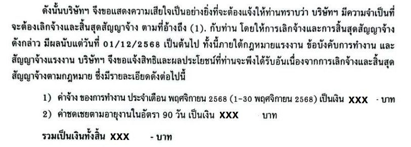 นายจ้างมีหนังสือเลิกจ้างและแจ้งสิทธิ์กรณีสิ้นสุดการจ้าง ระบุวันที่ 30/11/2568