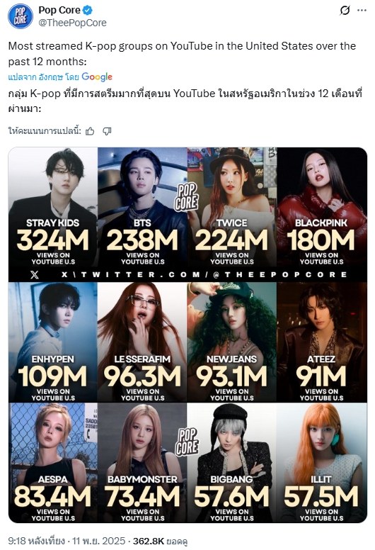 🔥 Stray Kids อันดับ 1 K-Pop ที่มียอดสตรีมสูงสุดบน YouTube ในสหรัฐอเมริกาช่วง 12 เดือนที่ผ่านมาด้วยยอดสตรีม 324 ล้าน
