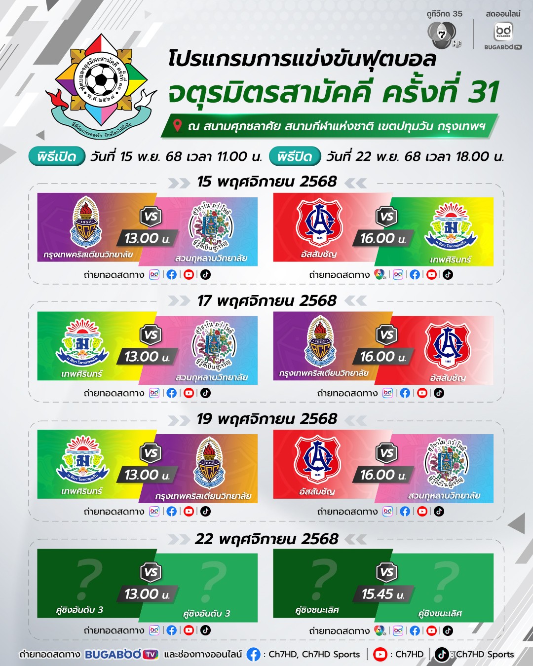 โปรแกรมการแข่งขัน ฟุตบอลจตุรมิตรสามัคคี ครั้งที่ 31 15 พ.ย. นี้