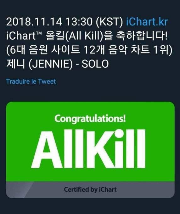 SOLO ของ JENNIE สามารถทำ Real-Time All Kill ได้ภายในเวลาเพียง 2 ชั่วโมงหลังจากปล่อยเพลงในปี 2018