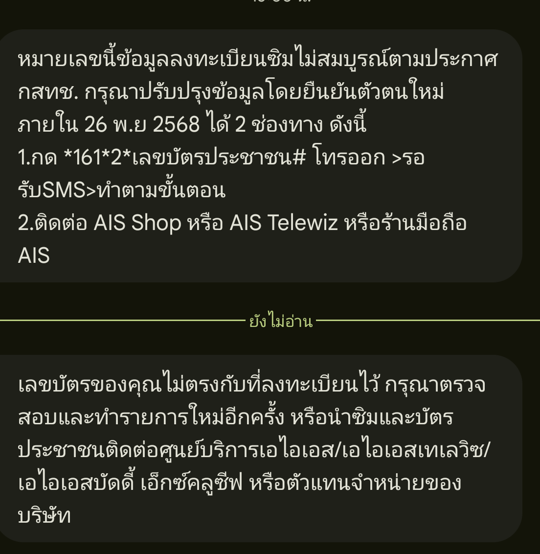 อยู่ดีๆก็ได้รับ SMS จาก AIS ว่า.. หมายเลขนี้ข้อมูลลงทะเบียนซิมไม่สมบูรณ์ตามประกาศ กสทช. กรุณาปรับปรุงข้อมูลโดยยืนยันตัวตนใหม่ ภายใน 14 พ.ย 2568 ได้ 2 ช่องทาง ดังนี้ 1.กด *161*2*เลขบัตรประชาชน# โทรออก