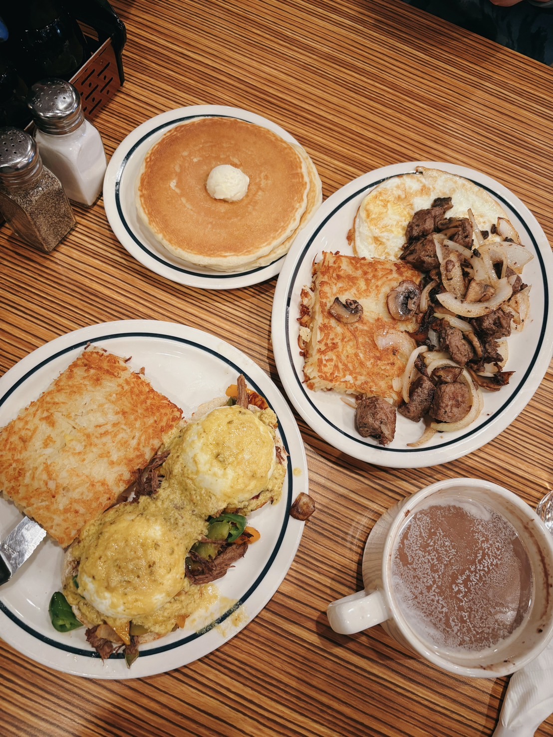 แวะทานข้าวเช้า+เที่ยงที่ IHOP สั่ง egg benedict , Sirloin eggs, แพนเค้ก และช็อกโกแลตร้อน สังเกตว่ามาแคนาดาคราวนี้ สินค้าไหนเป็นของแคนาดาจะติดว่า Made in Canada ไว้หมด วันนี้ท้องฟ้าหม่นๆ ออกจากร้านมาฝนตก ดูพยากรณ์แล้ว วันนี้อากาศจะเย็นลงอีก