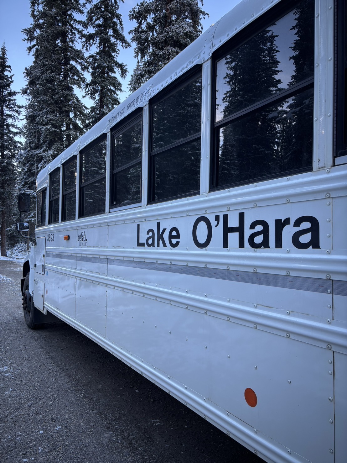 พวกเราต้องไปถึงไม่เกิน 8.15 เพื่อขึ้นรถบัสรอบ 8.30 จากนั้นเดินไปหาเจ้าหน้าที่ เอาใบจองให้เจ้าหน้าที่ดูแล้วขึ้นรถได้เลย พอคนครบ เจ้าหน้าที่จะขึ้นมาอธิบายวิธีปฏิบัติตัวในการเดินเขาใน Lake O’hara ถึงเวลารถออก พวกเรานั่งรถขึ้นไป 11 กิโล บนทางลูกรัง โยกไปโยกมาตลอดทาง หิมะก็เยอะกว่าแถวที่พักมาก