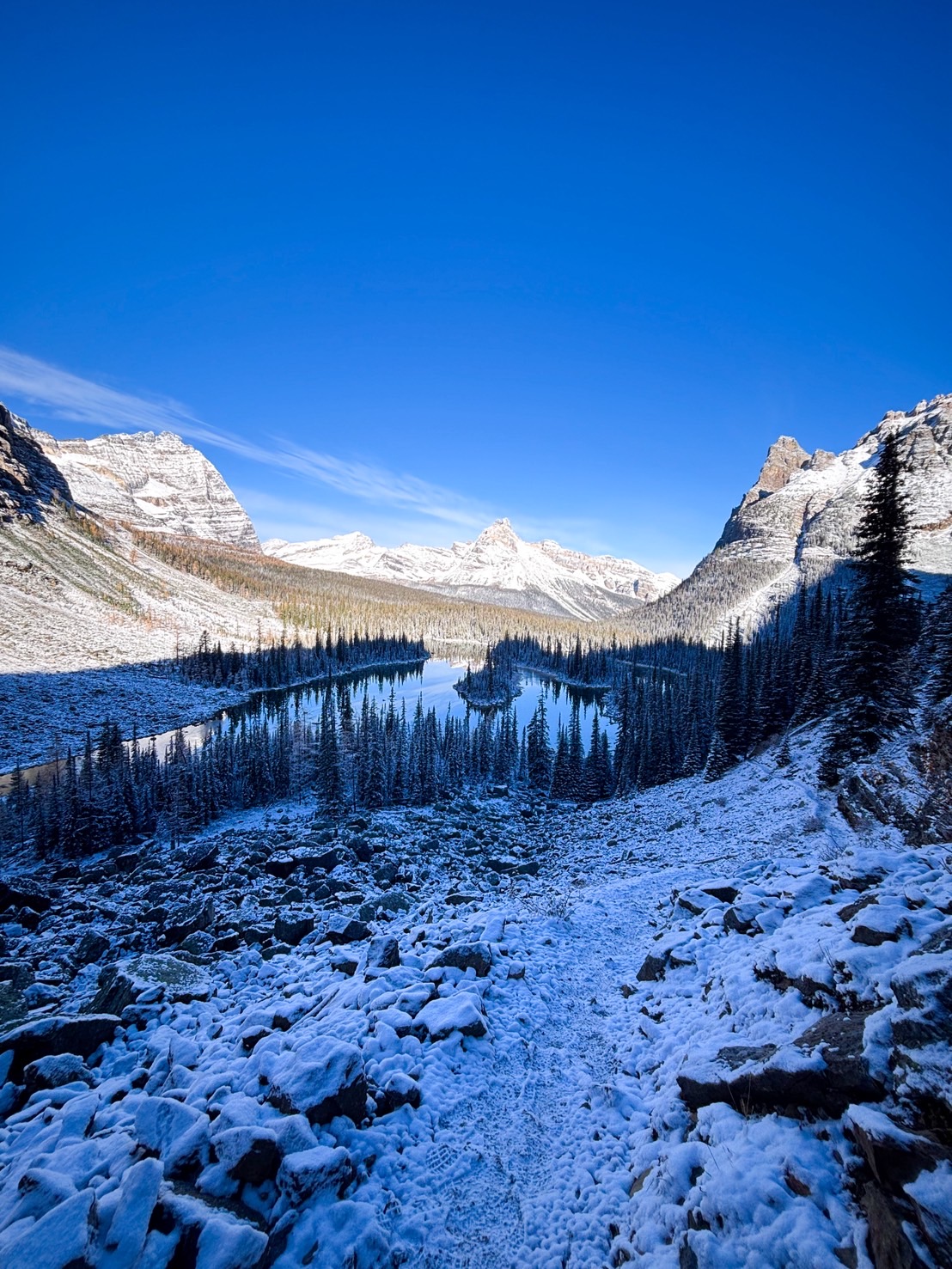 พวกเราจะเดินวนไปข้างๆทะเลสาบ O’hara ทาง West จากนั้นจะเป็นทางเดินหินๆ ชันๆ ขึ้นเขาไปเรื่อยๆ ตลอด 4-5 กิโล เจอคนเดินผ่านไปบ้าง แต่น้อย พอแบบนี้บางช่วงต้องระวังเพราะจะไม่มีรอยเท้าคนจะหาทางยาก เดินขึ้นเขาผ่านไป 2 ชม. อากาศติดลบ แต่เหงื่อออกได้ มุมถ่ายรูปไม่ค่อยมีเพราะเป็นทางเดินเขาแคบๆ
