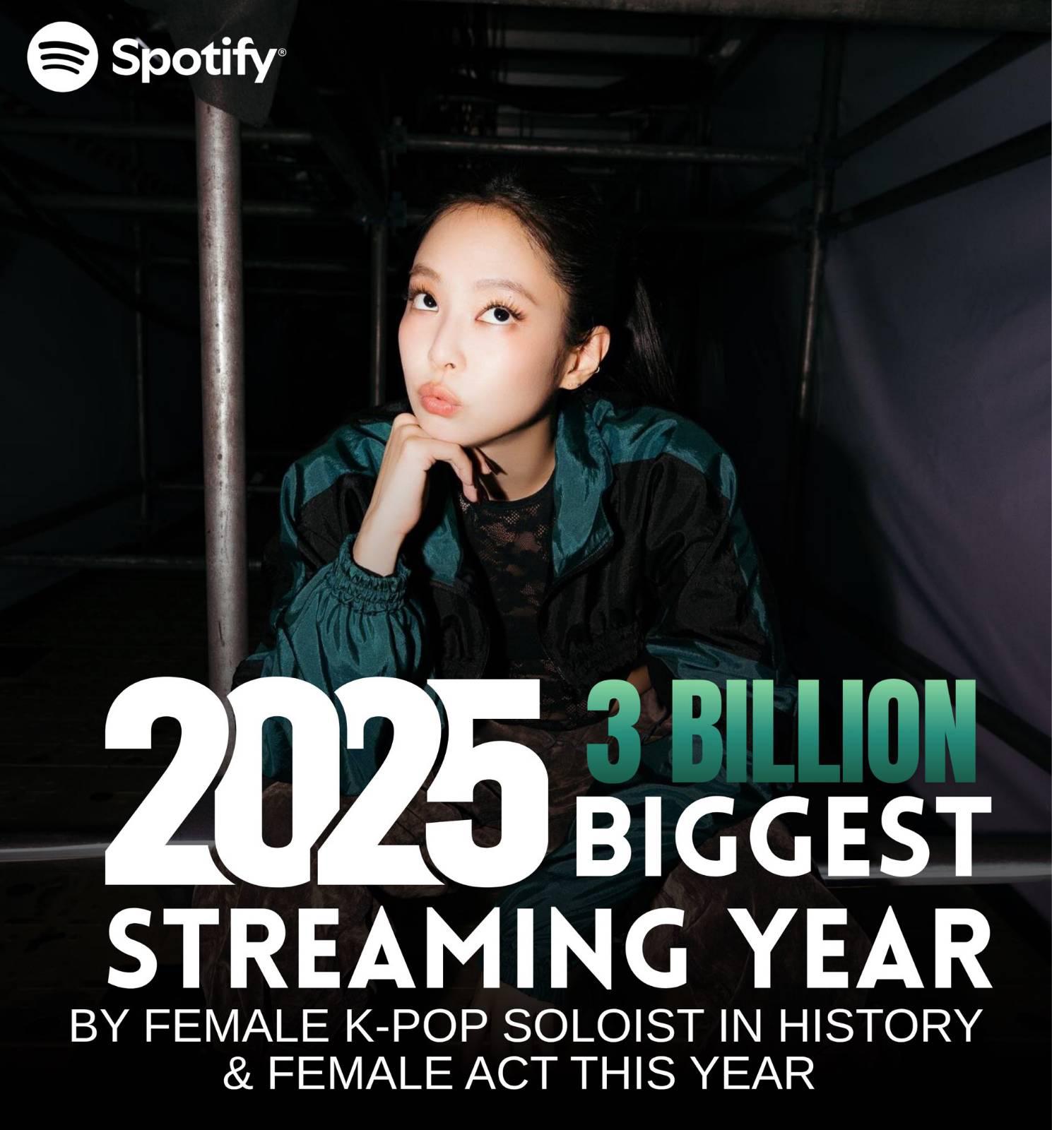 JENNIE มียอดสตรีมบน Spotify ทะลุ 3 พันล้านในปี 2025 ศิลปินหญิง K-POP และศิลปินเดี่ยว K-POP ที่มียอดสตรีมสูงที่สุดในปีนี้