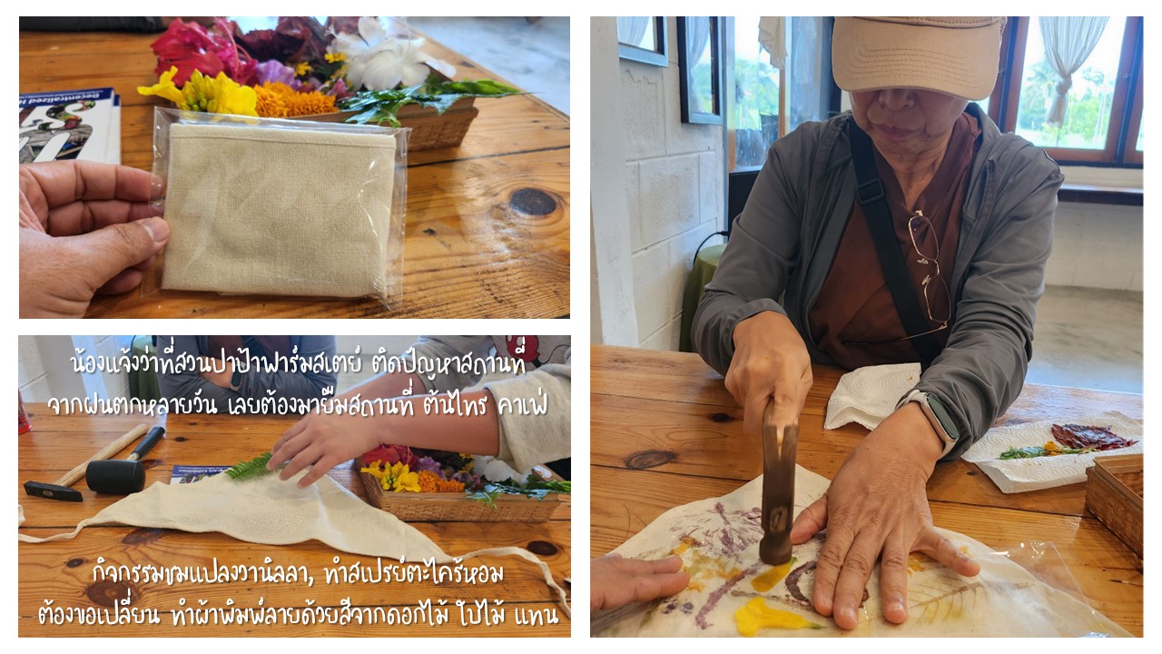 เนื่องจากที่สวน ไม่สะดวกด้วยเหตุฝนตก เรียนรู้วิธี พิมพ์ลวดลายบนผ้า จากดอกไม้หลากสี