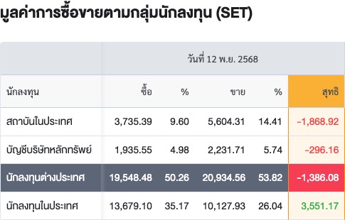Sinthorn Summary 12/11/2568 : ต่างชาติขายสุทธิ -1,386.08 ลบ.