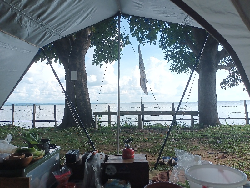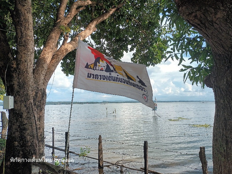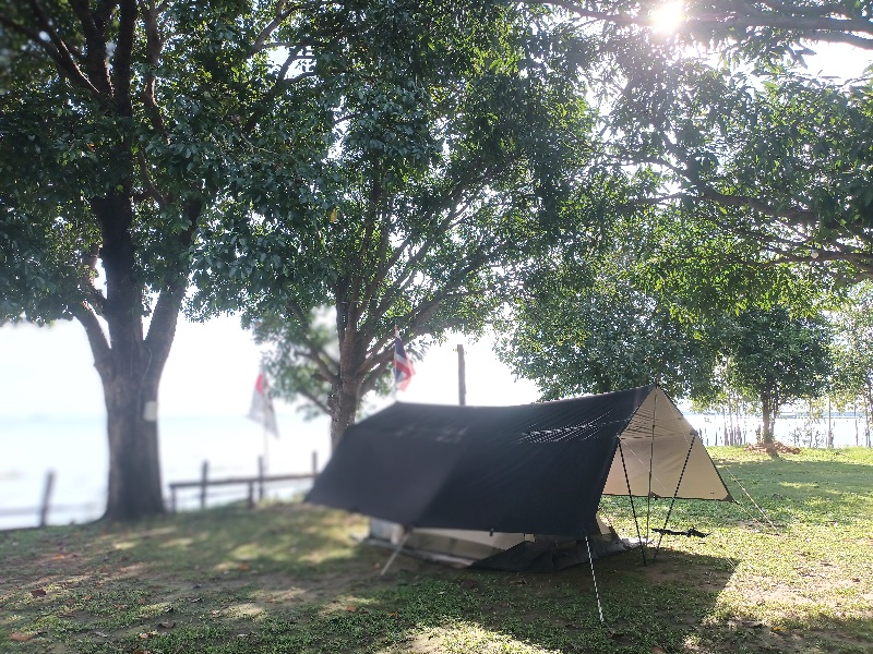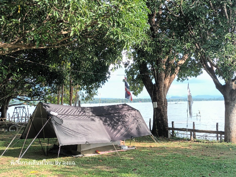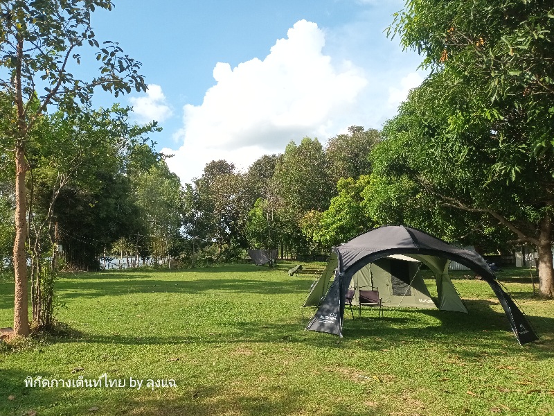 เลี้ยวขวาเข้าลาน ตรงเข้ามาลานจอดรถ ติดต่อเจ้าของลานที่เข้ามาต้อนรับพอดี พามาเลือกจุดที่กางใต้ร่มไม้ใหญ่ เห็นน้ำไกลๆ แบบเหมือนน้ำกับลานอยู่ระดับเดียวกัน แต่เจ้าของบอกว่า ไม่เคยท่วมลาน เพราะเขื่อนจะระบายน้ำออก