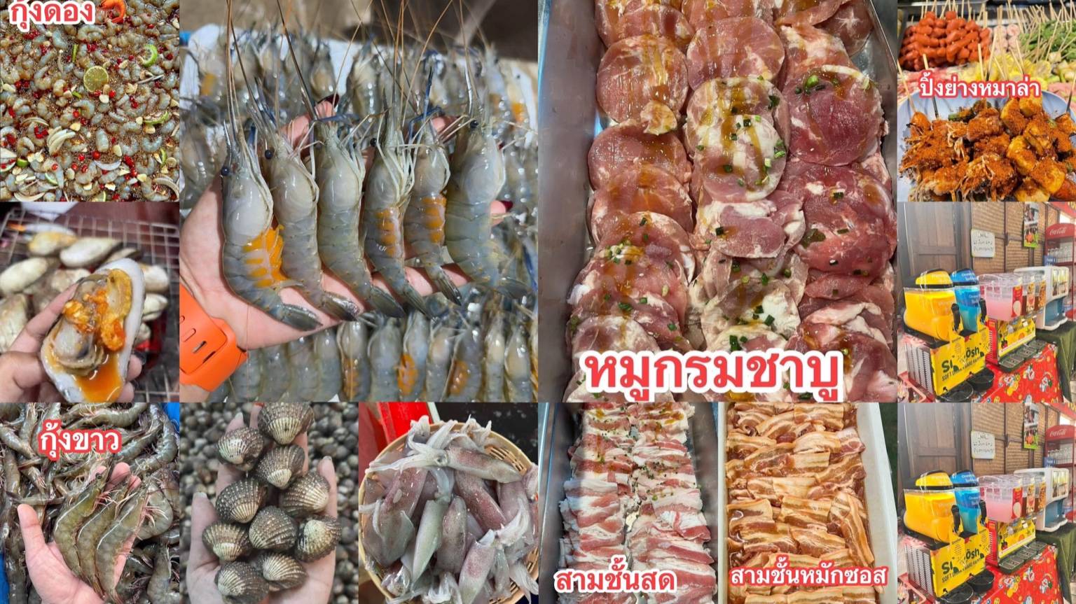 อาหารของทางร้านมีให้เลือกหลากหลาย เช่น หมูสามชั้นหมัก หมูกระบัง เนื้อหมักสูตรพิเศษ กุ้งสด ปลาหมึก หอยแครง รวมถึงของทานเล่นอย่างลูกชิ้น ไส้กรอก ผักสด และของหวานหลากชนิด วัตถุดิบสดสะอาด รสชาติกลมกล่อม และมีการเติมอาหารอย่างต่อเนื่อง ทำให้ลูกค้าสามารถรับประทานได้อย่างเต็มอิ่ม