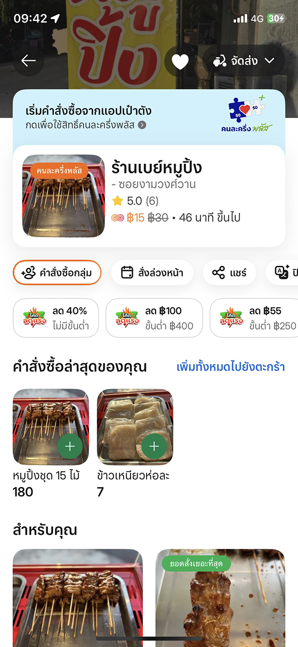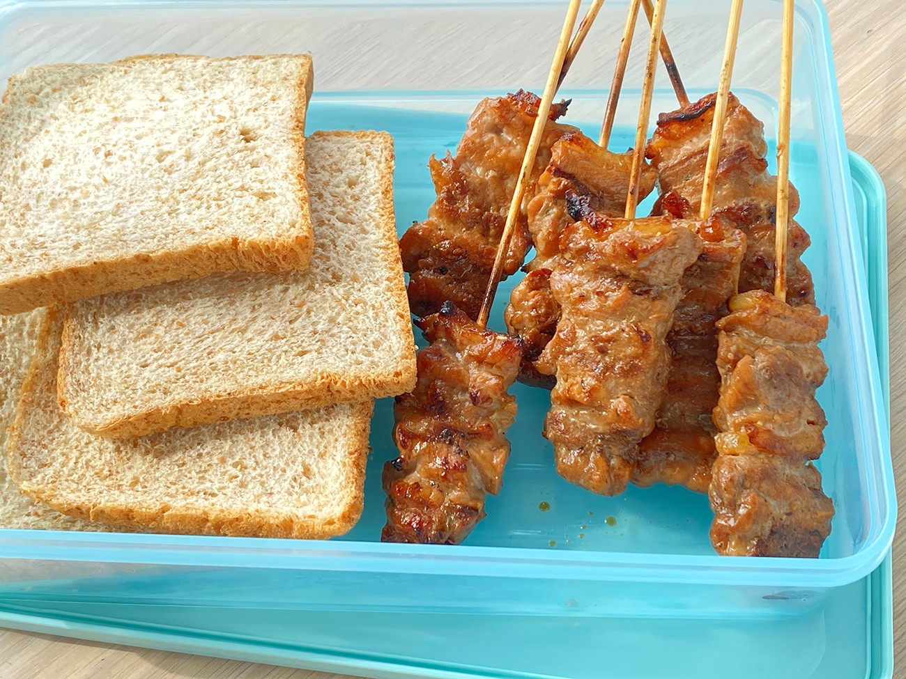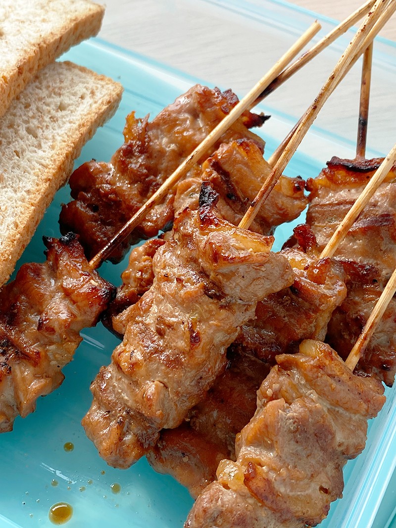 หมูปิ้งสั่งจาก grab ไม้ละ 12 บาท ไม้ใหญ่หนา (ลองเทียบกับขนมปัง) อร่อย หอมเครื่องเทศ