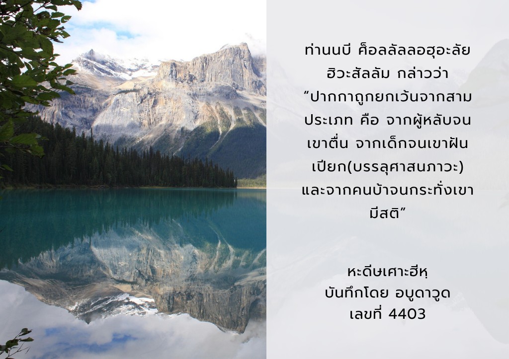 ท่านนบี ศ็อลลัลลอฮุอะลัยฮิวะสัลลัม กล่าวว่า “ปากกาถูกยกเว้นจากสามประเภท คือ จากผู้หลับจนเขาตื่น จากเด็กจนเขาฝันเปียก(บรรลุศาสนภาวะ) และจากคนบ้าจนกระทั่งเขามีสติ” (หะดีษเศาะฮีหฺ บันทึกโดย อบูดาวูด เลขที่ 4403)