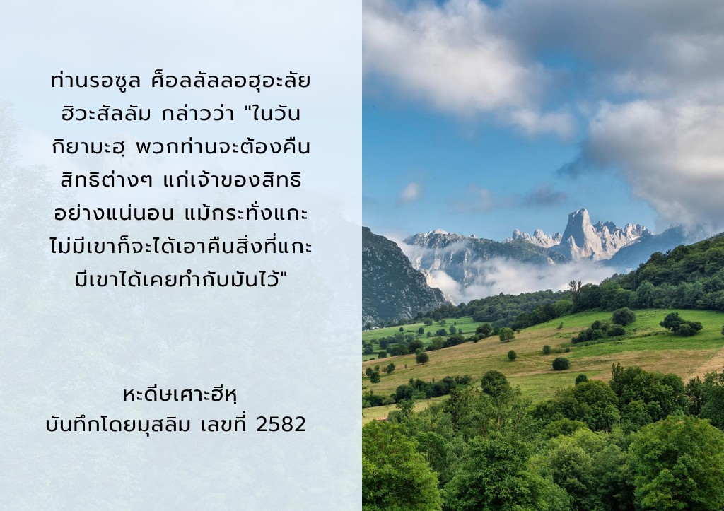 ท่านรอซูล ศ็อลลัลลอฮุอะลัยฮิวะสัลลัม กล่าวว่า “ในวันกิยามะฮฺ พวกท่านจะต้องคืนสิทธิต่างๆ แก่เจ้าของสิทธิอย่างแน่นอน แม้กระทั่งแกะไม่มีเขาก็จะได้เอาคืนสิ่งที่แกะมีเขาได้เคยทำกับมันไว้” (หะดีษเศาะฮีหฺ บันทึกโดยมุสลิม เลขที่ 2582)