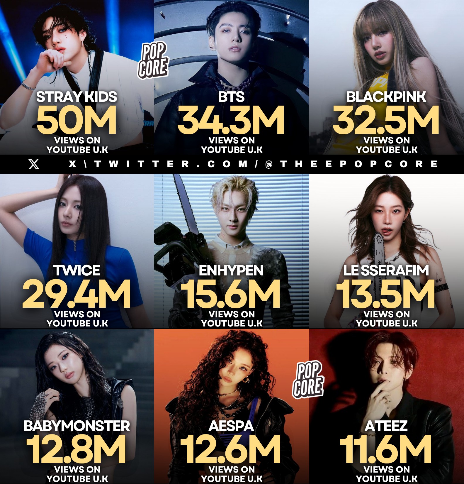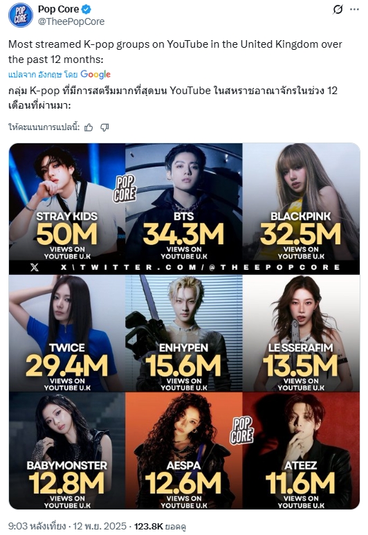 🔥 Stray Kids เป็นวงดนตรี K-pop อันดับ 1 ที่มียอดสตรีมสูงสุดบน YouTube ในสหราชอาณาจักรในช่วง 12 เดือนที่ผ่านมา โดยมียอดสตรีมมากกว่า 50 ล้านครั้ง