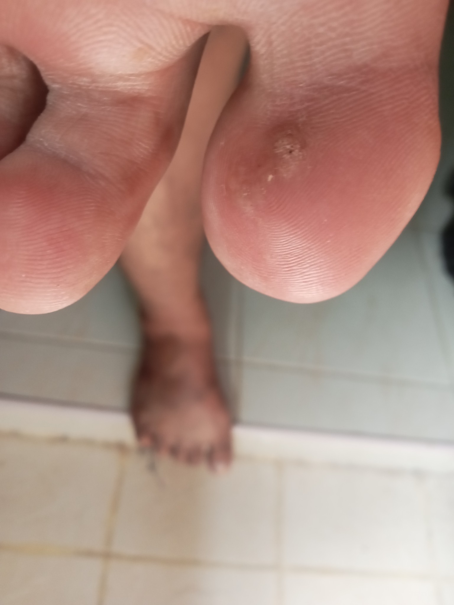 ก่อนที่ผมจะเห็น หนังมันจะแข็งๆครับ คล้ายตาปลา แต่มันไม่เจ็บเลยครับ พอลอกที่แข็งๆออกมันก็นุ่ม ผมเลยสังเกตเห็นสีแปลกๆตรงนิ้วโป้งเท้า กดก็ไม่เจ็บ ลงเท้าก็ไม่เจ็บครับ