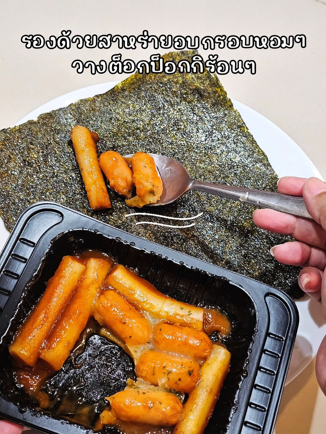 เตรียมจานรองด้วยสาหร่ายอบกรอบหอม ๆ วางต๊อกบกกีร้อน ๆ ลงไปให้ซอสเยิ้ม ๆ นิด ๆ