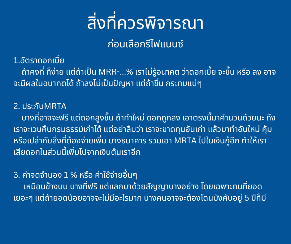 และอย่าลืม การรีไฟแนนซ์ เป็นการเซ็นสัญญาใหม่ กับที่ใหม่ อ่านเงื่อนไขแฝงให้ดี ย้ำ อ่านให้ดี อย่าเชื่อแค่ที่เค้าบอกว่า ดอกเบี้ยถูก คุ้มกว่าหลายแสน แต่แลกกับการที่มีค่าใช้จ่ายอื่นๆ ซ่อน หรือ บังคับอยู่ 5 ปีกับดอกสูงๆ 2 ปี ระลึกไว้เลย ธนาคารไม่ใช่พ่อพระจะให้อะไรเราฟรีๆ เค้าหวังเงินคืนกลับทุกเวลาครับ 5555 แต่ถ้าได้ฟรีหมด ก็ถือว่าดีมากๆ เลยครับ